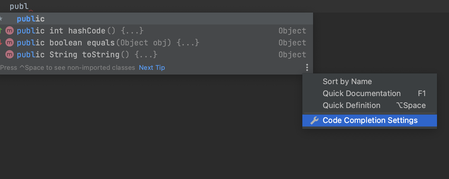 现在,您可以直接从代码补全弹出窗口中的垂直省略号菜单按钮访问 Code Completion Settings(代码补全设置)并配置偏好设置。