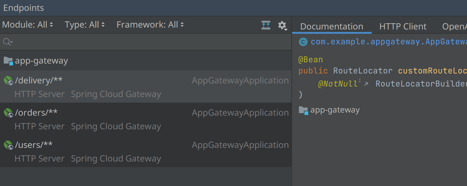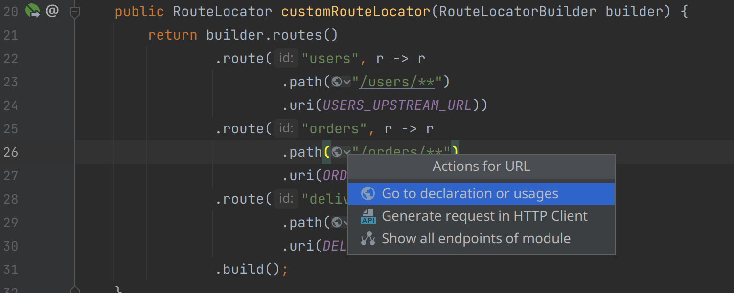 IntelliJ IDEA Ultimate 现在为 Spring Cloud Gateway URL 提供了 URL 补全、Search Everywhere(随处搜索)功能和 Find Usages(查找用法)提示。 使用 Endpoints(端点)工具窗口可以轻松生成 HTTP 请求或查找所有网关路由。