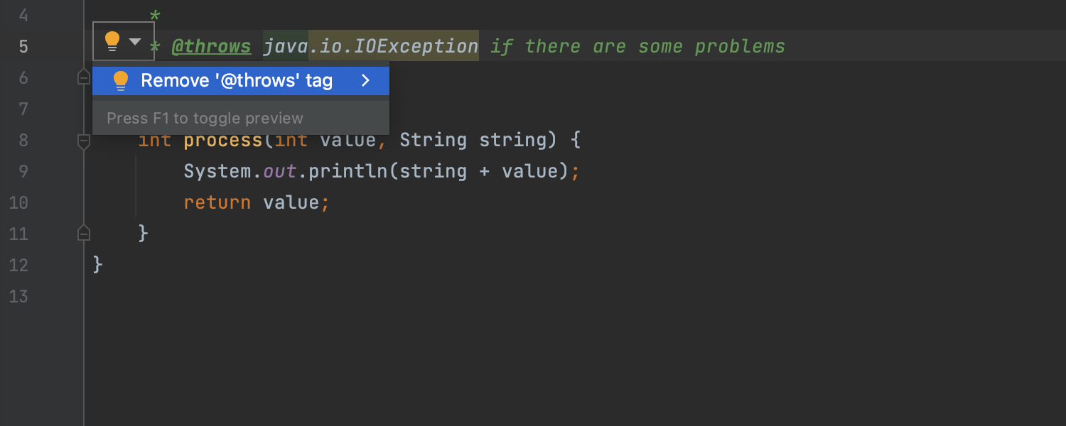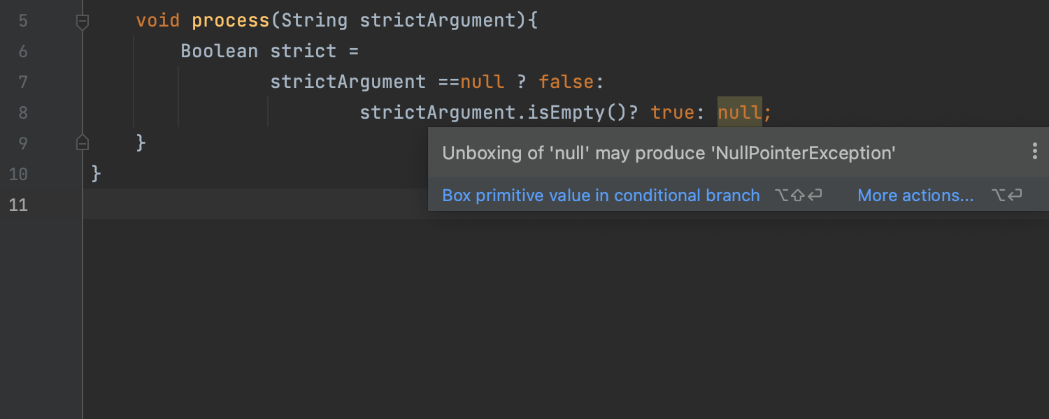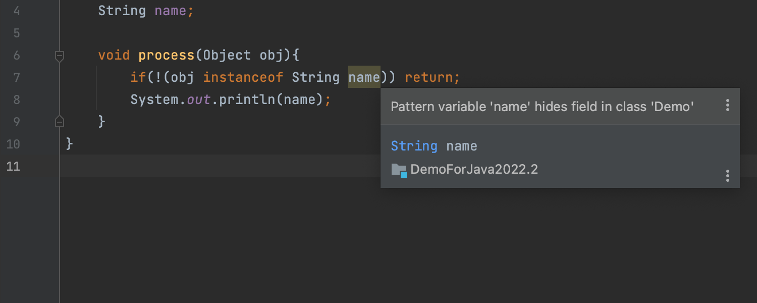 在匿名函数内部使用 return 关键字跳出函数而不执行其中的所有代码时,IntelliJ IDEA 2022.2 现在会发出警告。 这通常不是预期用法,并且可能导致泄漏的实现和隐藏的性能开销。 当 private 或 class 形参隐藏超类变量时将触发新警告。 此外,试图以编译器禁止的方式覆盖变量时会显示错误。 如果存在对应编译器选项(-Xlint:nonlocal-return 和 -Xlint:private-shadow),可以将这些新警告配置为显示。