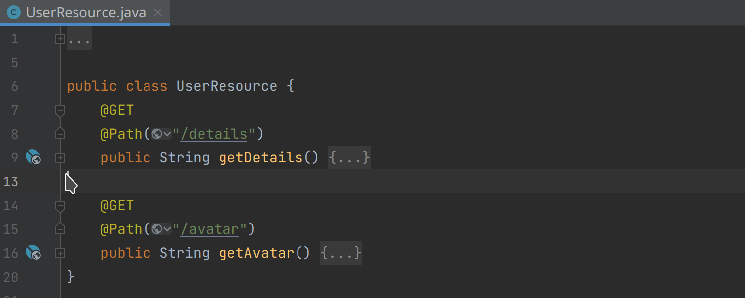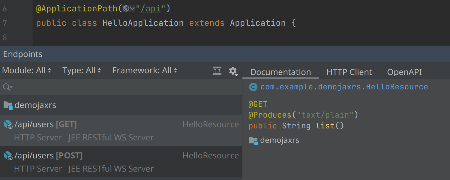 IntelliJ IDEA 现在正确支持声明为 @ApplicationPath 的 JAX-RS 通用 Web 服务 URL 模式以及 URL 补全、导航和 Find Usages(查找用法)中的子资源。