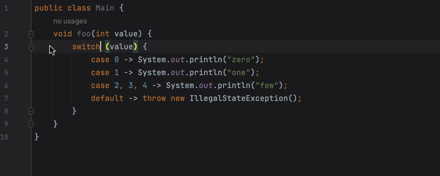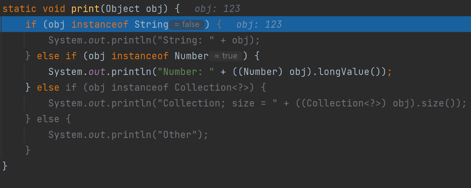 我们改进了 Java 调试器中的数据流分析 (DFA) 功能。 DFA 辅助已经预测了某些表达式的未来值。 现在,当分析器可以预测代码的某个分支不会被执行时,它会灰显对应代码部分。