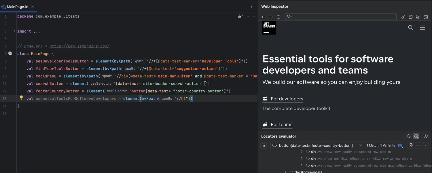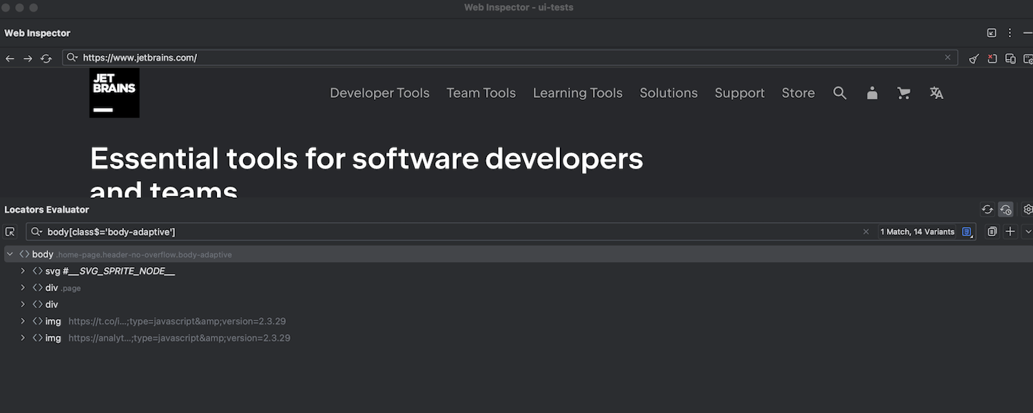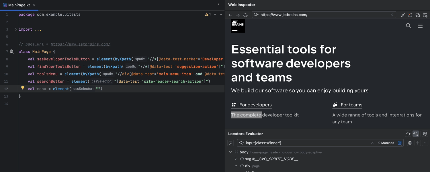 Aqua 插件为 UI 自动化提供了高级支持。 在 v2022.3 中,它为 Web 检查器引入了更新,让您可以在两种模式下使用:在 IDE 内或在单独窗口中(如需更多空间)。