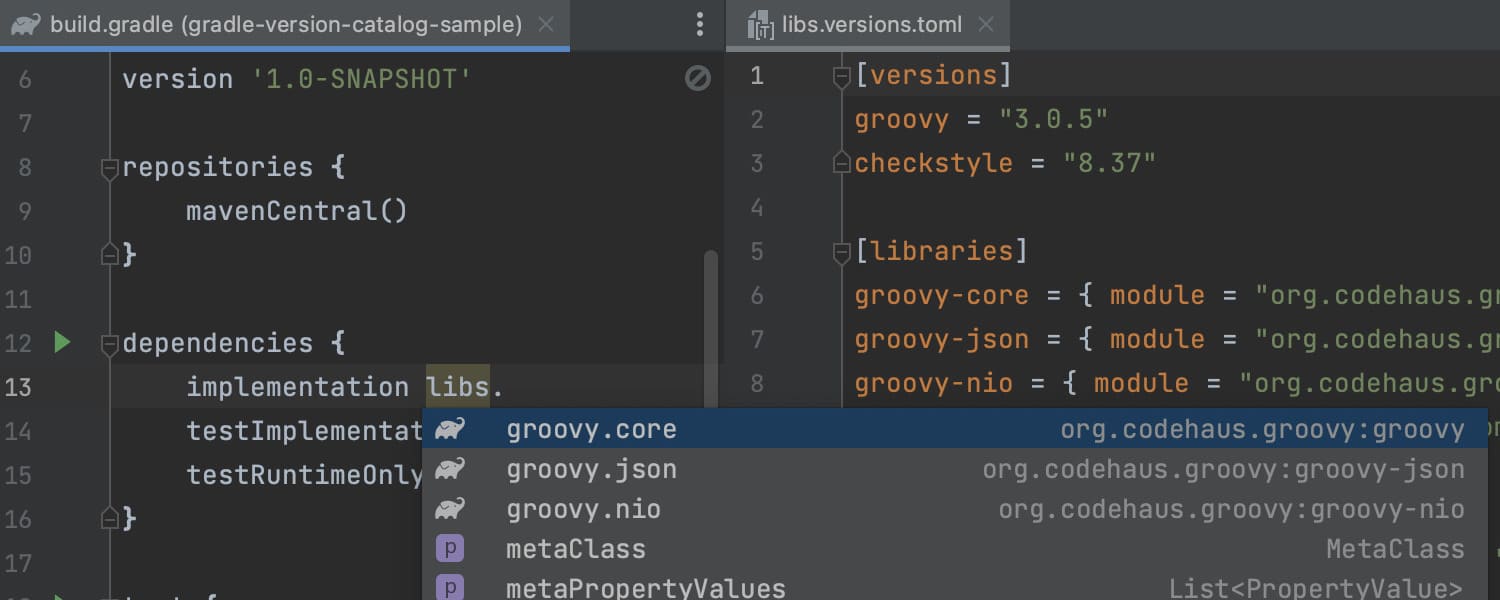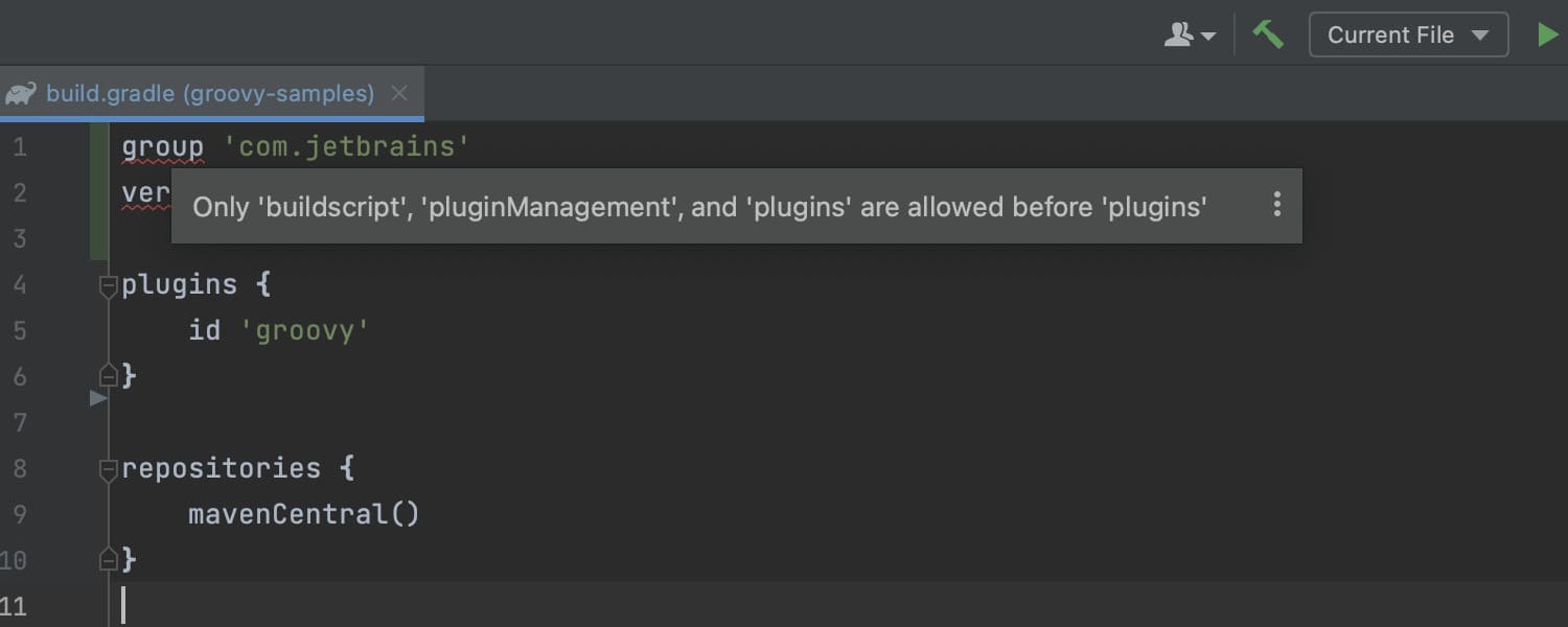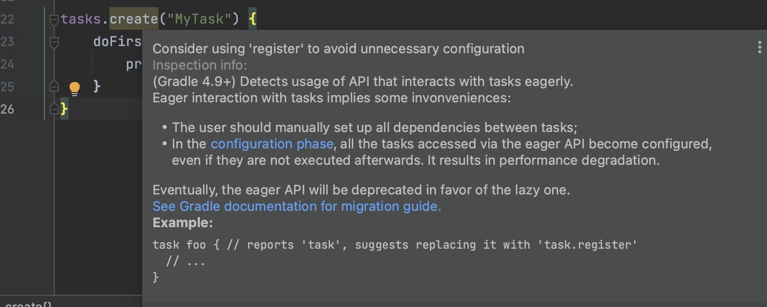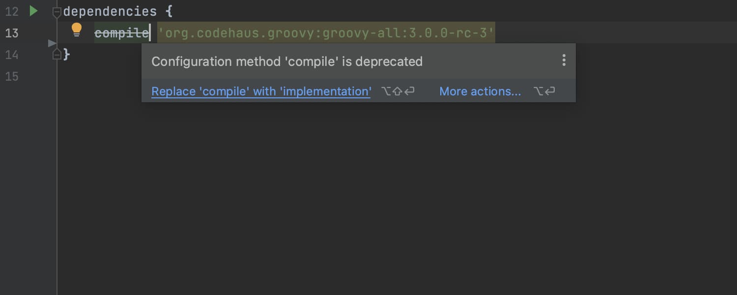 IntelliJ IDEA 2022.3 为 Groovy Gradle 版本目录 提供了代码补全和导航功能。 我们还微调了 Groovy 的 build.gradle 文件中的代码高亮显示,并实现了一些新检查。 IDE 现在会高亮显示已弃用的配置方法并建议适用替换选项。 它还能够检测构建脚本中插件 DSL 的不正确用法,并提供了一组新检查来鼓励使用任务配置规避 API,如 Gradle 所推荐。