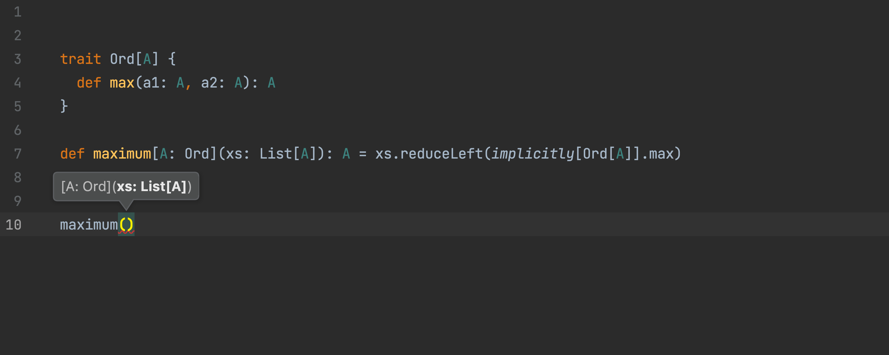 现在会为类型形参显示形参信息(此前只为值形参显示),而且更加智能。 以前,您可能在 参数信息 弹出窗口中看到,上下文范围 被去糖化,显示了隐式参数。 现在,提示中的代码被重新加糖,可读性更强。 这可能特别适合使用更高类型的库的维护者。