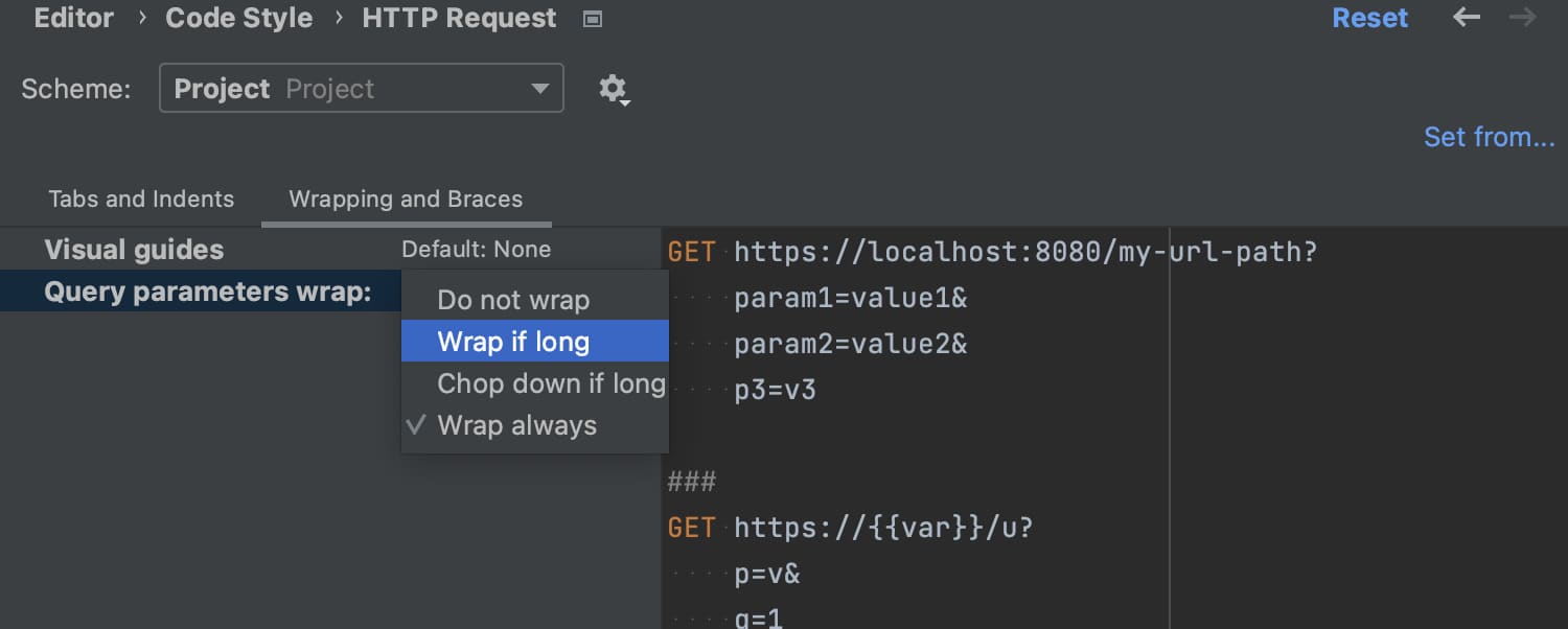 HTTP 客户端现在为具有长 URL 的请求提供了更好的格式设置选项。 您也可以使用 Put query parameters on separate lines(将查询形参置于单独的行中)意图操作,将查询拆分成不同行中的小片段。 为了帮助您管理 HTTP 请求格式设置,我们在 Settings/Preferences | Editor | Code Style | HTTP Request | Wrapping and Braces(设置/偏好设置 | 编辑器 | 代码样式 | HTTP 请求 | 换行和大括号)中实现了一个新选项。