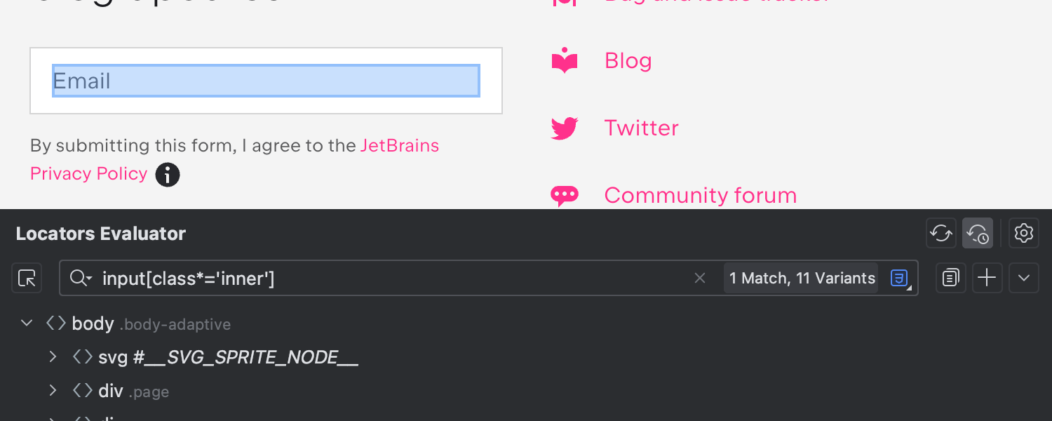 Aqua 插件提供了新的 Web 检查器功能 – 定位器评估器。 对于您提供的任何定位器,定位器评估器都将高亮显示它在网页上指向的所有元素,并告知匹配项数量。 您还可以选择其他定位器选项。