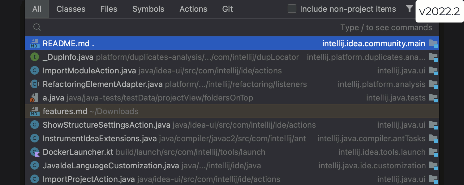 我们微调了 Search Everywhere(随处搜索)结果列表背后的算法,使其行为更可预测,使搜索的元素的选择更加准确。 现在,开始输入查询时,IDE 会冻结出现的第一个搜索结果,并且不会在找到更多选项时对其重新排序。 此外,机器学习排名现在对 Files(文件)标签页默认启用,这样可以提高结果的准确性并缩短搜索会话。