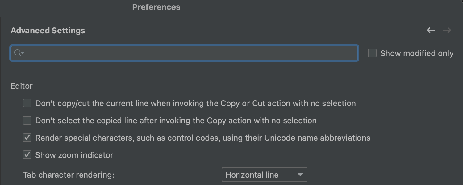 我们重做了粘贴操作 (Ctrl+V) 的行为。 现在,如果在没有选择代码的情况下复制 (Ctrl+C) 或剪切 (Ctrl+X) 一行,粘贴操作会将剪贴板的内容添加到当前行上方,而不是像旧版本一样添加到文本光标处。 此外,Settings/Preferences | Advanced Settings(设置/偏好设置 | 高级设置)中新增了一个选项,可供在未选择任何内容的情况下调用复制操作后禁用复制行的选择。