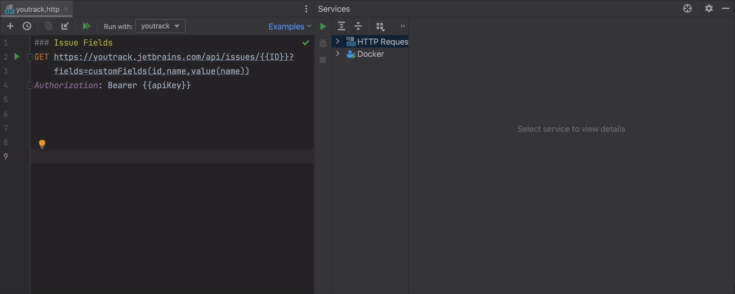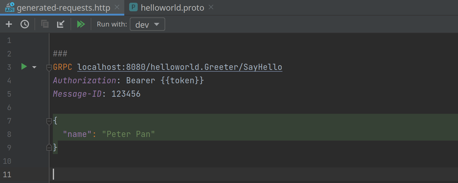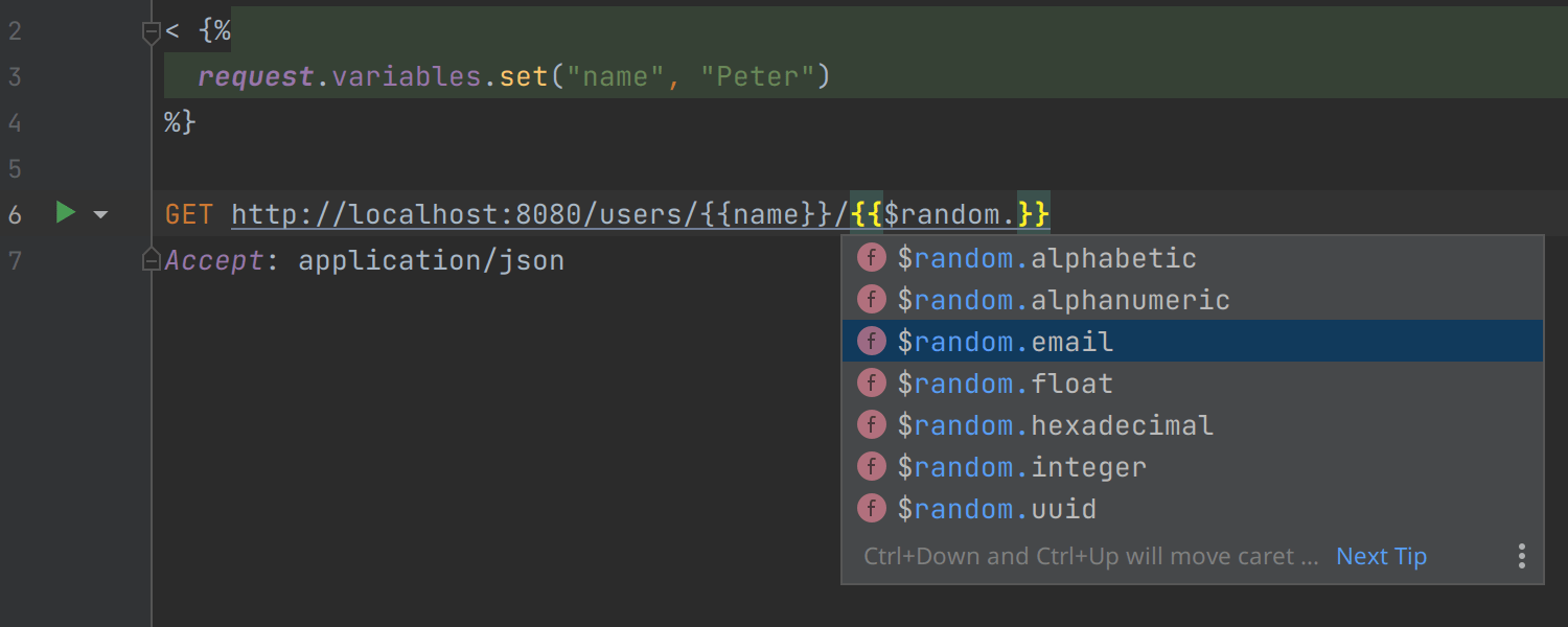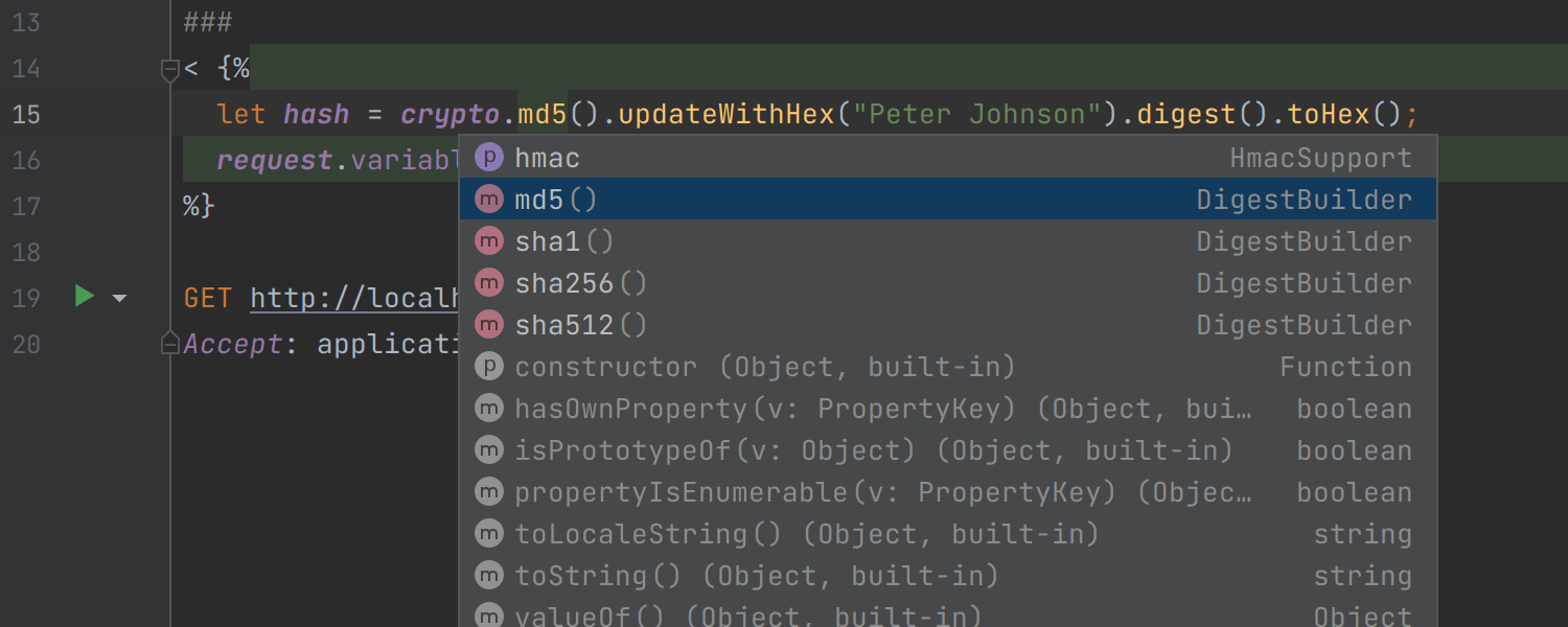 HTTP 客户端现在支持在请求之前执行的脚本块。 您可以在请求执行之前生成一些数据,并使用变量将其放入最终请求。 IntelliJ IDEA Ultimate 现在还提供 сrypto API,使代码能够计算 HTTP 请求的 md5 或 sha1 哈希值。 对于简单的情况,IDE 现在具有一组新的随机变量。 此外,我们还在 HTTP 客户端中添加了对 gRPC 元数据的支持,让您可以将元数据作为请求头传递。