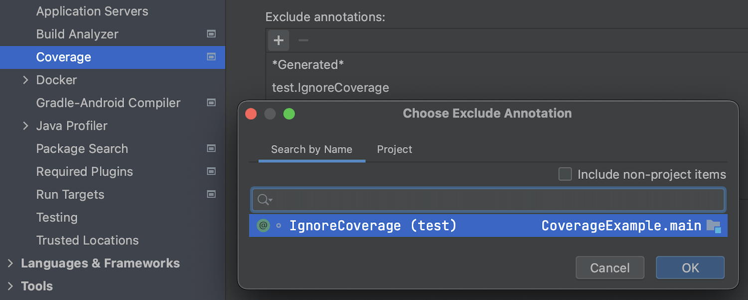 IntelliJ IDEA 2022.3 让您管理项目中的哪些注解将被用来排除覆盖率统计中的方法。 要将不想测试的方法通知 IDE,首先用任意注解标记,然后转到 Settings/Preferences | Build, Execution, Deployment | Coverage(设置/偏好设置 | 构建、执行、部署 | 覆盖)并将注解添加到 Exclude annotations(排除注解)列表。