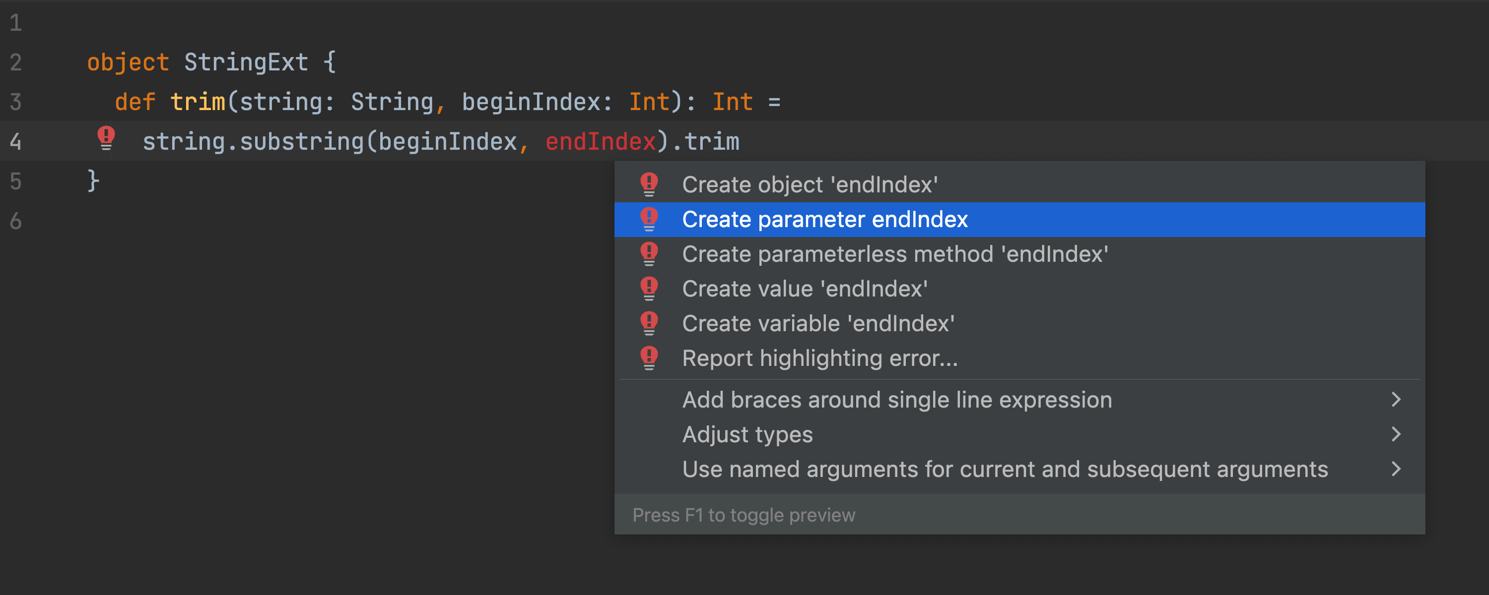 如果在方法中有一个未解析的符号,新增的快速修复可以将这个符号添加到方法的形参列表。