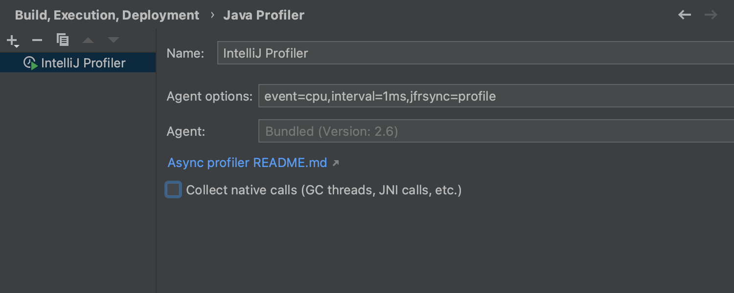 在 v2022.3 中,我们重做了原生调用在快照中的显示方式。 为了减少调用次数并更快调查最常见的性能问题,原生调用默认不会被收集并被排除在快照之外。 如果您仍想跟踪原生调用以获得应用程序运行时的最完整概况,则可以在 Settings/Preferences | Build, Execution, Deployment | Java Profiler(设置/偏好设置 | 构建、执行、部署 | Java 分析器)中启用。