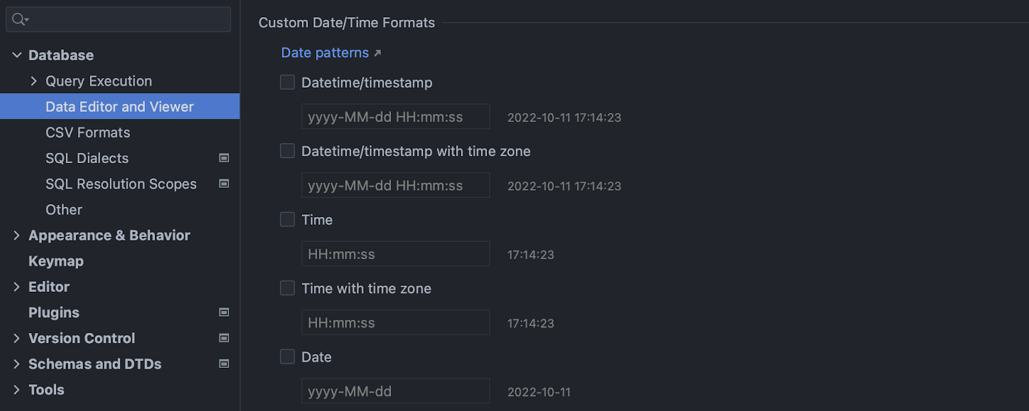 现在,可以自定义 Datetime/timestamp(日期时间/时间戳)、Time(时间)和 Date(日期)类型的字段在数据编辑器中的显示方式。 设置位于 Database | Data Editor and Viewer(数据库 | 数据编辑器和查看器)中。 接下来,我们将添加对 Zoned time(分区时间)和 Zoned timestamp(分区时间戳)类型的支持。