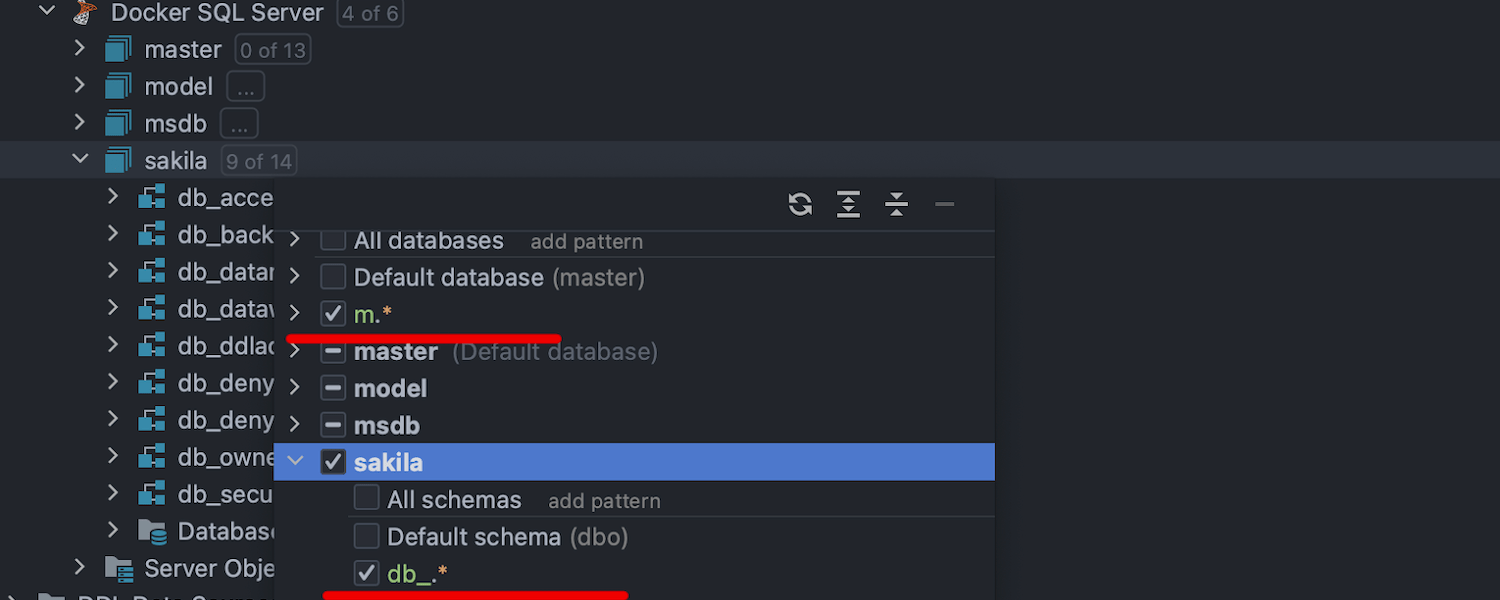 从 v2022.3 开始,可以根据正则表达式模式选择数据库或架构进行内省。 为此,点击 Add Pattern(添加模式)并在新节点中定义正则表达式模式。 将根据该模式选择数据库或架构。 添加多个模式将组合多样性,而不是创建其交集。 All(所有)节点现在的行为与以前的版本不同,它不会自动选择默认架构。 您现在需要在 All schemas(所有架构)、Default schema(默认架构)或应用正则表达式筛选器之间选择。