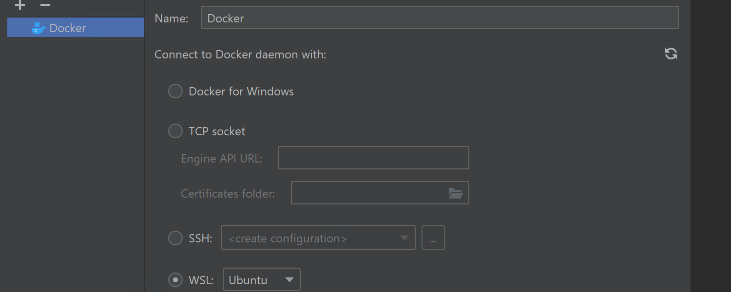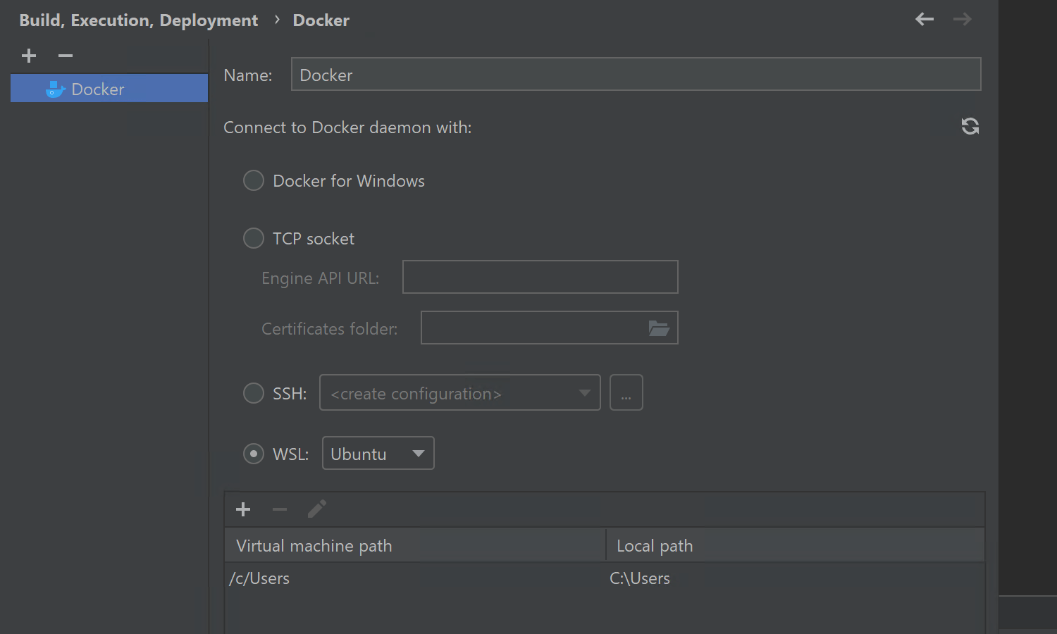 从 v2022.3 起,IntelliJ IDEA 支持连接到 WSL 中运行的 Docker。 您可以在 Settings / Preferences | Build, Execution, Deployment | Docker(设置/偏好设置 | 构建、执行、部署 | Docker)中设置此类连接。