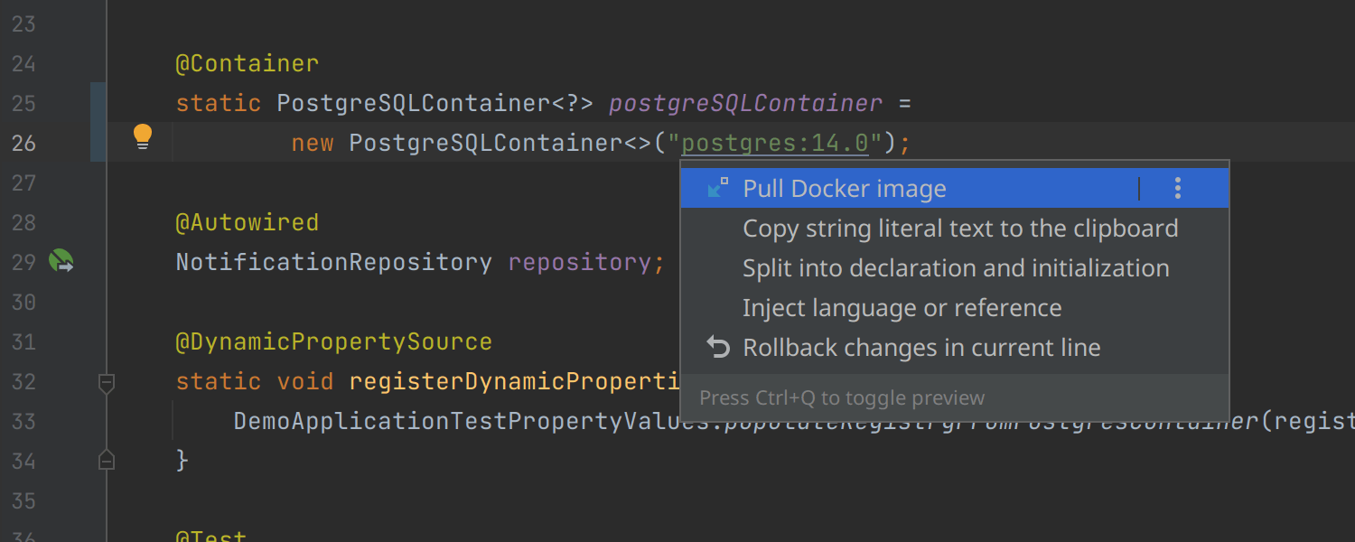 新增的方式可供轻松拉取所需镜像,而无需从 Dockerfile、docker-compose.yml 或使用 Testcontainers 的测试中运行。 只需在高亮显示的镜像名称上调用上下文操作 (Alt+Enter),然后选择 Pull Docker image(拉取 Docker 镜像)。