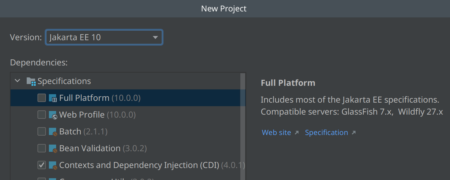 IntelliJ IDEA Ultimate 现在为 Jakarta EE 10 提供全面支持。 您可以在 File | New Project | Jakarta EE(文件 | 新建项目 | Jakarta EE)中选择 Jakarta EE 10,使用新规范版本创建项目。