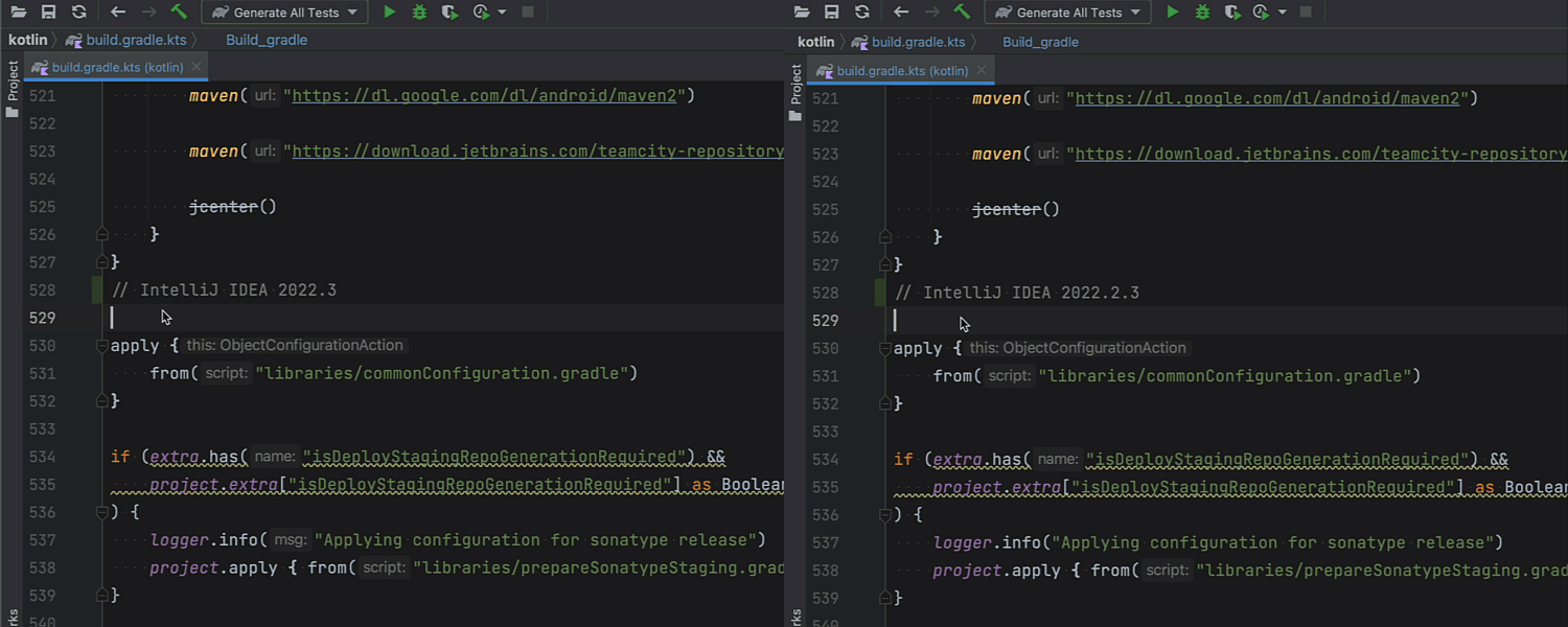 我们优化了缓存和索引的使用,使代码分析更快、更稳定。 我们还改进了 .gradle.kts 文件中的代码补全算法,根据我们的基准测试,它的速度提高了 4-5 倍。