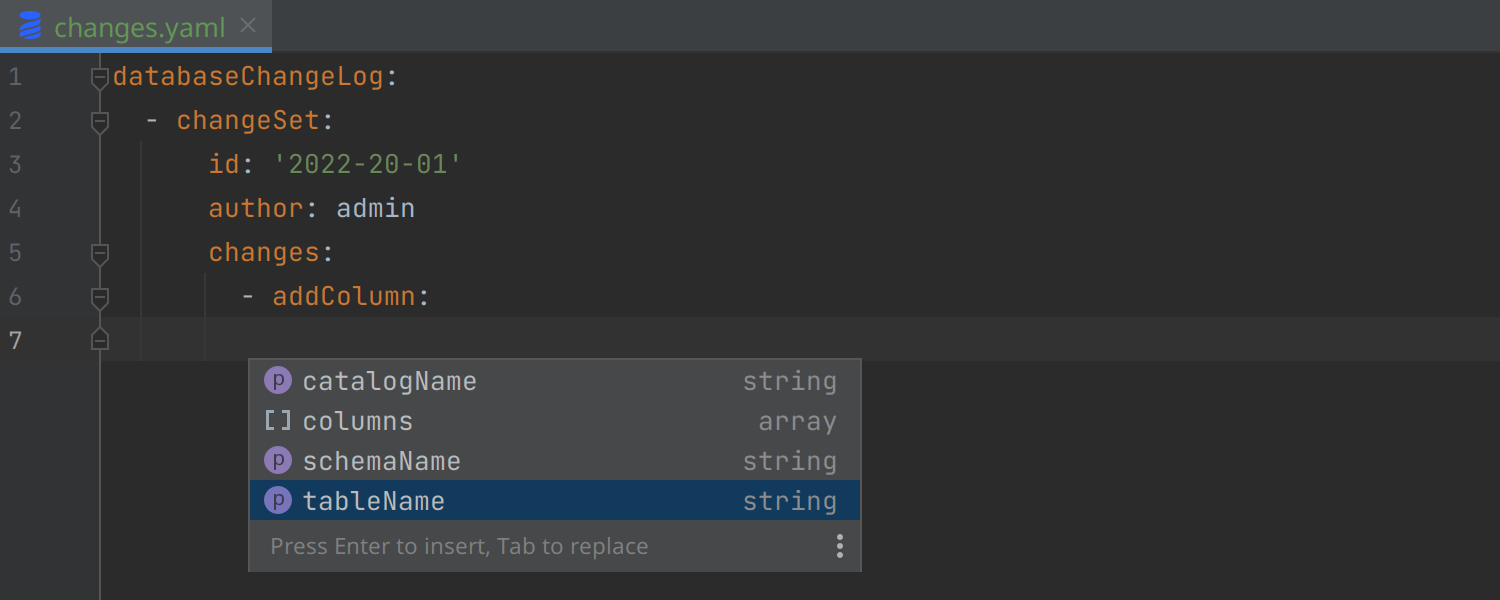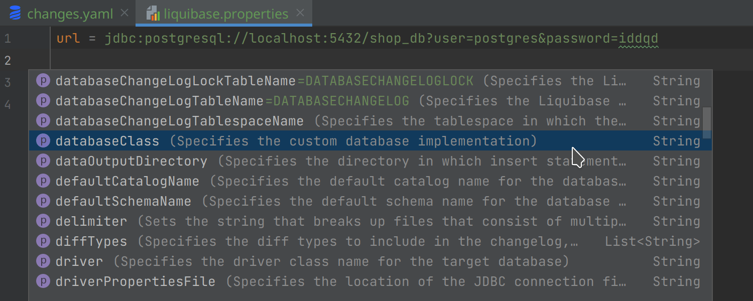 我们扩展了 Liquibase 工具的代码洞察功能。 您可以在 db/changelog/ 目录上调用 File | New | Liquibase Changelog(文件 | 新建 | Liquibase 更改日志)轻松创建新的 Liquibase 更改集文件。 此外,IntelliJ IDEA Ultimate 现在还会为 Liquibase YAML 文件提供高亮显示、代码补全和验证,并在 liquibase.properties 文件中建议所有可用的代码补全选项。