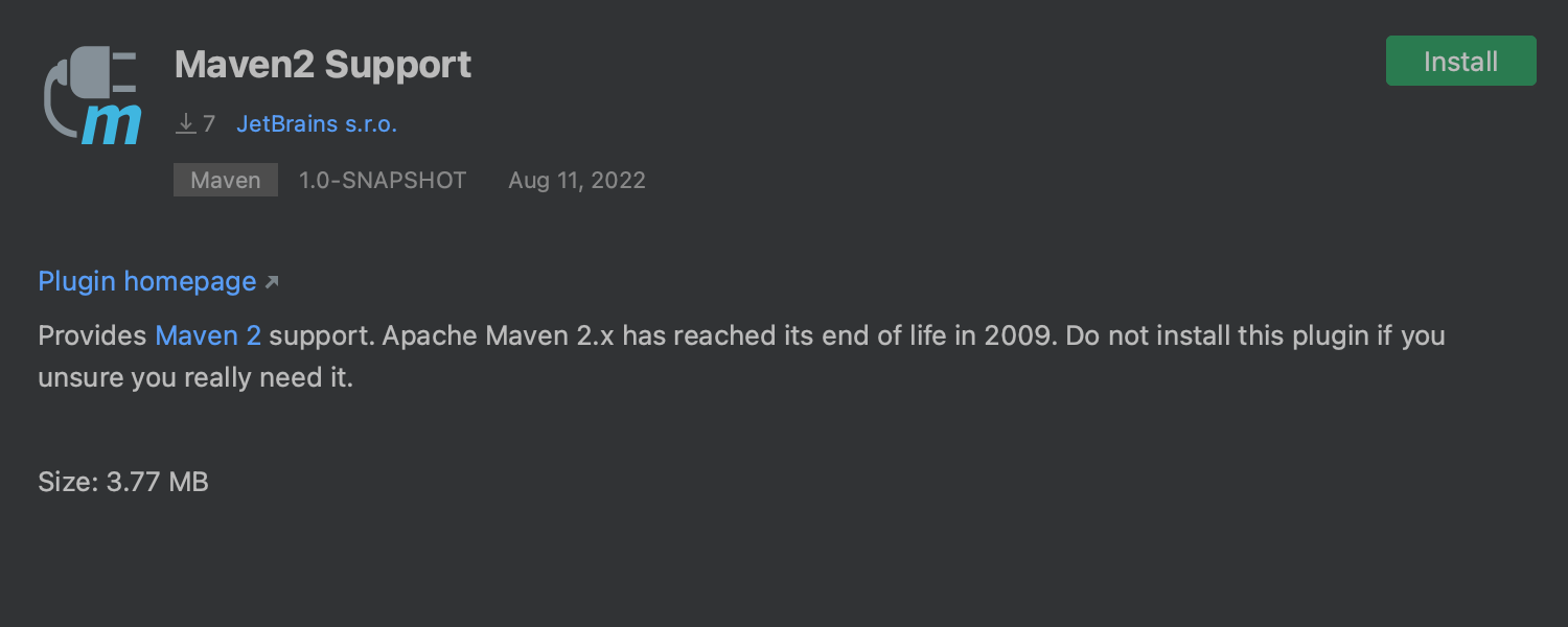 从 v2022.3 开始,我们将解绑对 Maven2 的支持,改为通过一个独立插件提供,您可以从 Settings/Preferences | Plugins(设置/偏好设置 | 插件)查找并安装或从 Marketplace 下载。