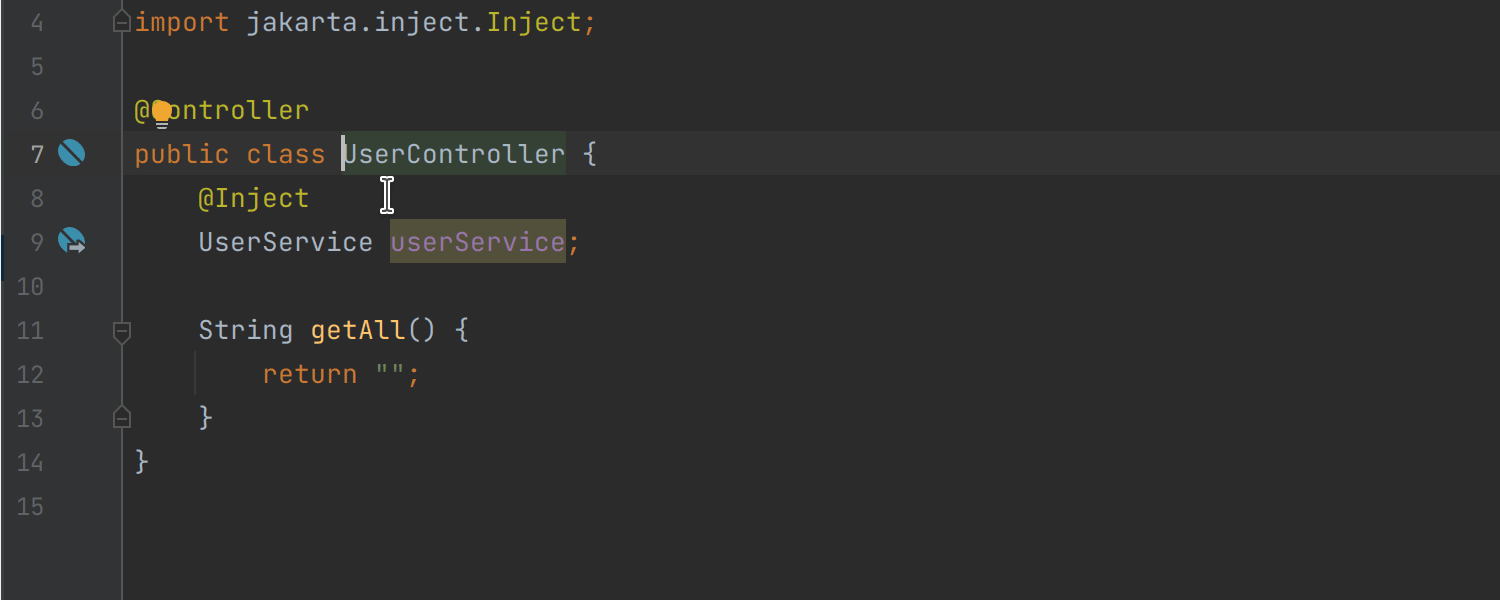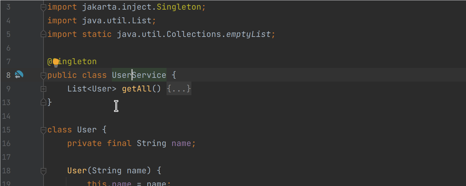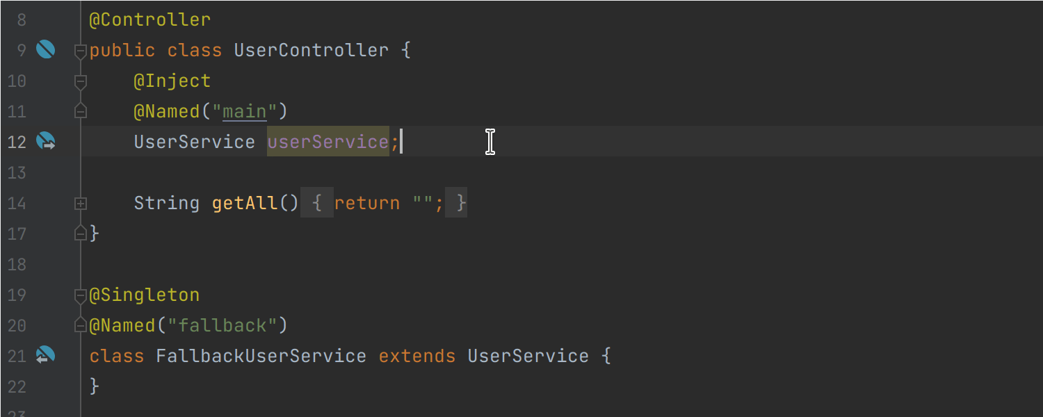 IntelliJ IDEA Ultimate 2022.3 提供了一项新检查,可以确认 Bean 注入点并报告缺失或不明确的依赖项。 我们还使用 Bean 限定符(例如 @Named、@Primary 等)改进了对注入依赖项和检查的导航。 此外,您现在可以使用装订区域图标导航到注入的 Bean。