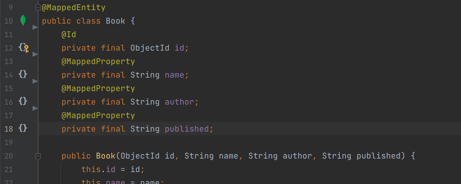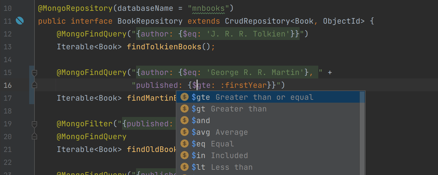 JSON 片段现在被注入到 Micronaut MongoDB 查询注解中。 IntelliJ IDEA Ultimate 还提供针对运算符和形参的代码高亮显示,以及针对字段和运算符的代码补全。 现在会对 Micronaut 映射实体类及其字段显示导航装订区域图标,可供轻松打开映射集合的 Database(数据库)工具窗口。