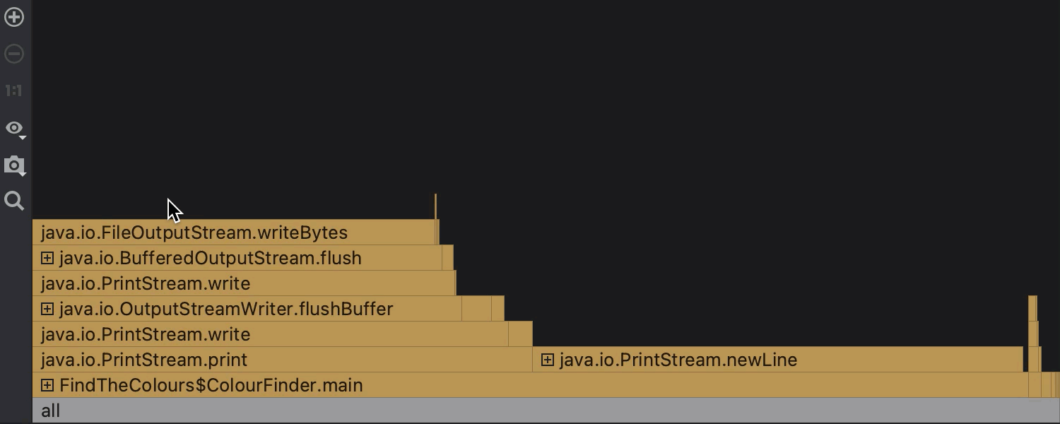 我们引入了一项新功能,它将占用其父项时间和标准库方法实现(例如 java.util)绝大部分时间的调用序列分组,并将其显示为火焰图上的收起列表。 这使处理数据和关注最可能的优化目标(需要大量计算资源的调用)更加容易。 此外,我们还使弹出窗口的响应性更强,并为其添加了一个标尺,帮助您专注于相对于记录快照的总执行时间的调用持续时间。