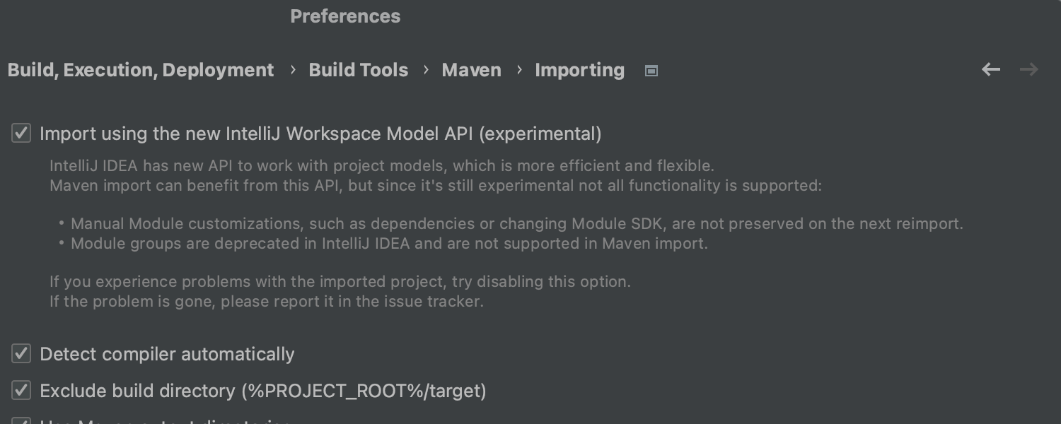 使用 IntelliJ IDEA 2022.3,我们引入了使用 新的 IntelliJ 工作区模型 API 的实验性 Maven 导入功能。 此更改有望在导入 Maven 项目时提高最高 10% 的速度。 选项现在在 Settings/Preferences | Build, Execution, Deployment | Build Tools | Maven | Importing(设置/偏好设置 | 构建、执行、部署 | 构建工具 | Maven | 导入)中默认启用。 请注意,并非所有功能在此阶段都可用,部分手动模块设置在重新导入时不会保留。