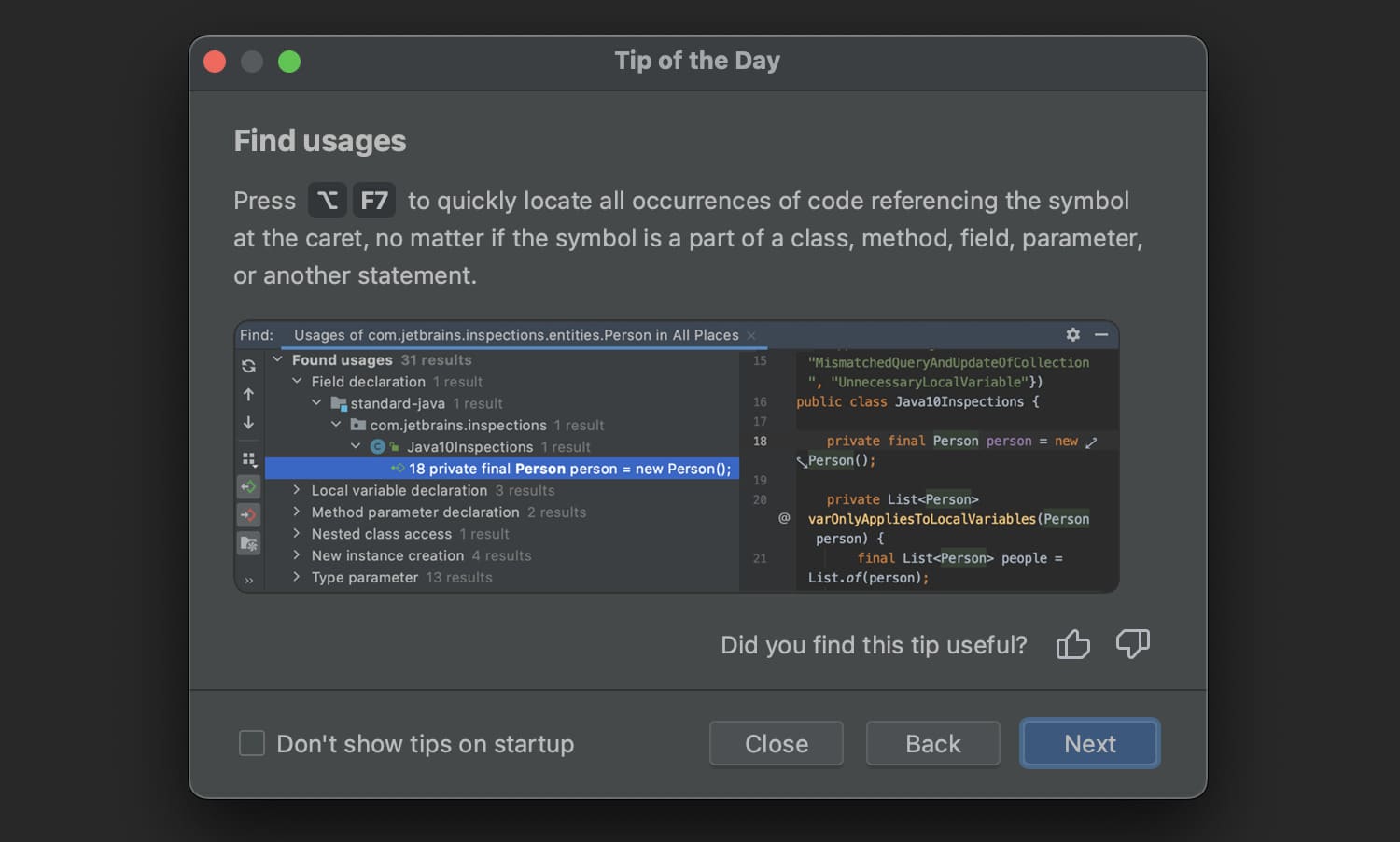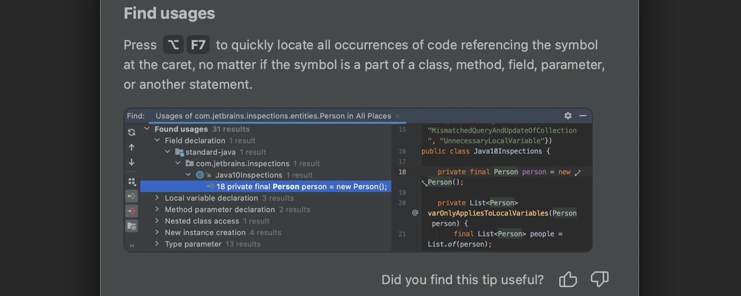我们对 Tips of the Day(每日小技巧)的外观和行为做出了多项更改,使其更实用且更易理解。 我们更新了对话框的设计,为每个小技巧添加了标题以指定描述的 IDE 区域,并实现了技巧评分功能以收集反馈。 我们还微调了确定显示哪些提示的算法,让您可以看到与 IDE 体验和正在处理的项目最相关的提示。 了解详情