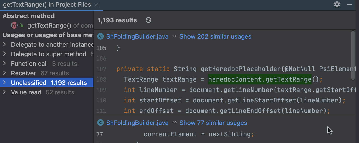 Find Usages(查找用法)现在提供有关代码元素如何在项目中使用的更深入信息。 借助集群算法,IDE 现在可以分析搜索结果,检测最常见的用法模式,并根据结构相似性将所有找到的用法分类。 这些用法集群显示在 Find Usages(查找使用)工具窗口的 Preview(预览)标签页中。