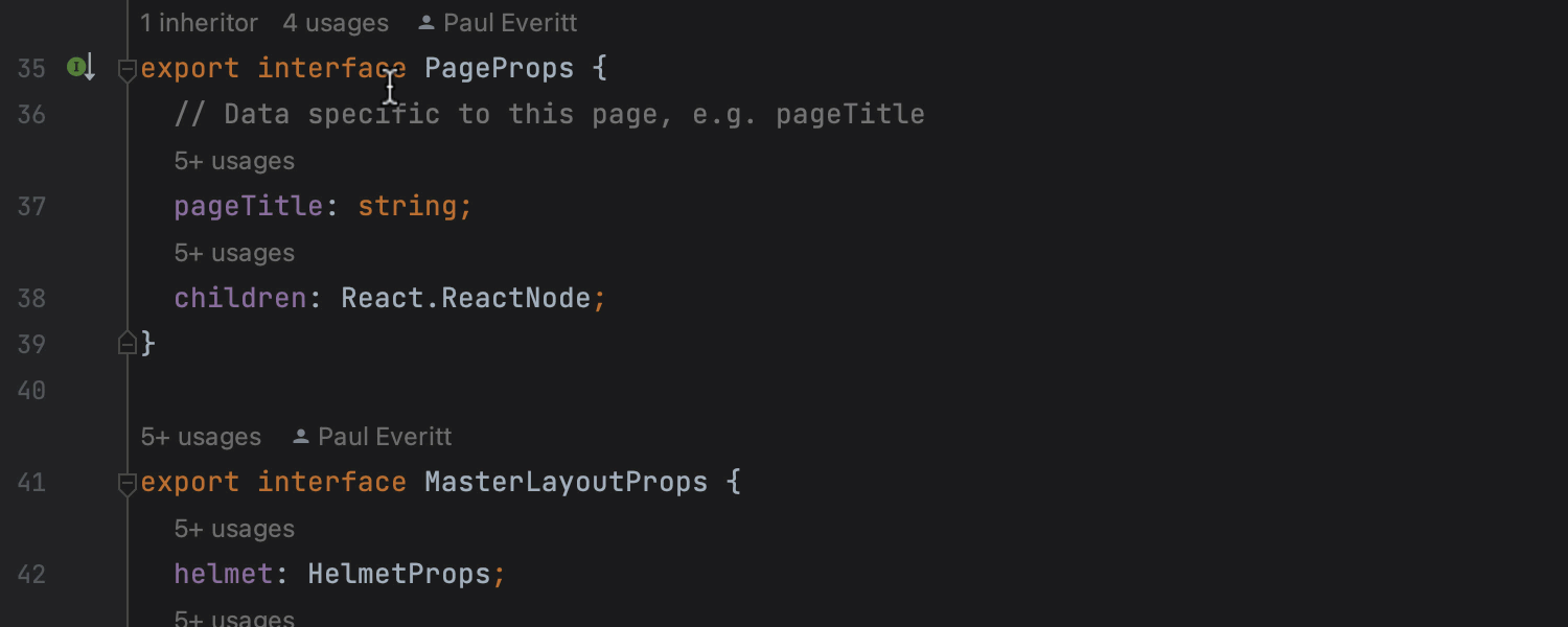 我们针对 JavaScript 和 TypeScript 实现了 Code Vision 嵌入提示。 这些提示让您可以直接在编辑器中即时了解代码,显示 inheritors(继承者)、usages(用法)、code authors(代码作者)和 related problems(相关问题)等指标。