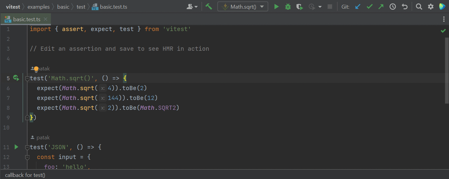 IntelliJ IDEA 2022.3 现在支持 Vitest,这是一个 Vite 原生单元测试框架! 您可以用所有您期望的主要方式运行、重新运行和调试测试,包括通过装订区域图标。 此外,监视模式在所有测试场景下默认均已启用。 在监视模式下还支持快照测试和覆盖率,从而在编码时为您提供几乎即时的覆盖率反馈。