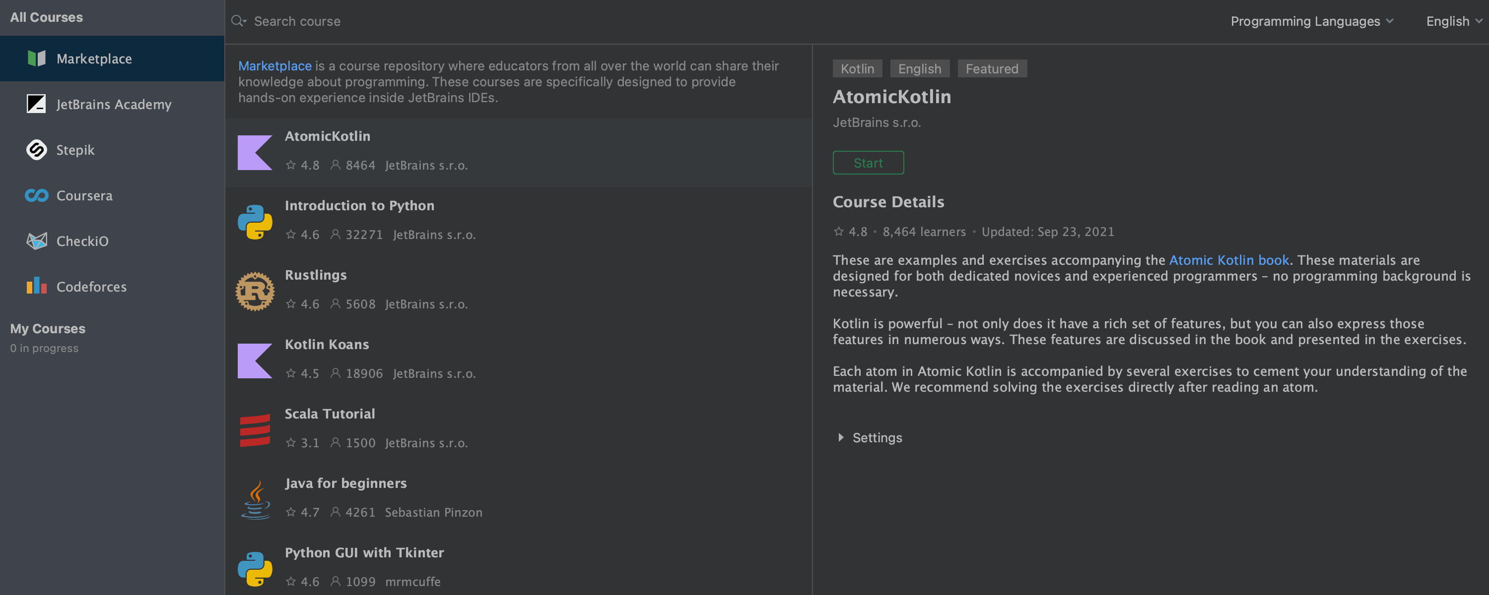 现在,可以直接在 IDE 中学习 Java、Kotlin、Scala、Python、Go 和其他编程语言或者提高现有技能。 新功能还提供了创建个人教育课程的功能。 要访问此功能,请转到欢迎屏幕上的 Learn(学习)标签页,点击 Enable Access(启用访问)。 注意,对于 Java 和 Kotlin 以外的语言,您需要安装一个额外插件。