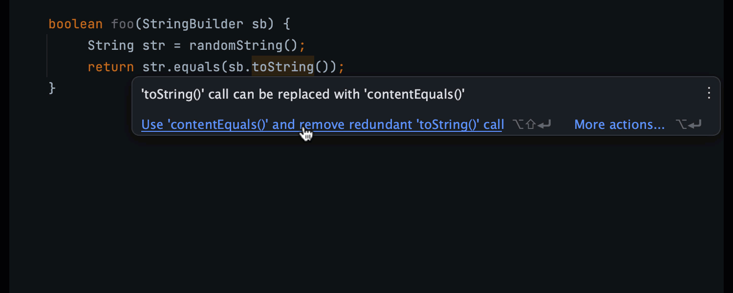 为了帮助保持代码干净无误,我们升级了一些现有 Java 检查并添加了新的检查。 Malformed format string(格式错误的字符串)检查现在会报告不符合常见 Java 语法的非法时间转换。 Redundant String operation(冗余的 String 操作)检查现在能够检测冗余的 StringBuilder.toString() 调用并提供快速修复将其替换为 contentEquals(),从而让您可以不创建中间 String 对象。 它还报告 String 构造函数调用中不必要的实参,并建议将其移除的快速修复。 在这篇博文中详细了解 IntelliJ IDEA 2023.1 的其他代码检查改进。