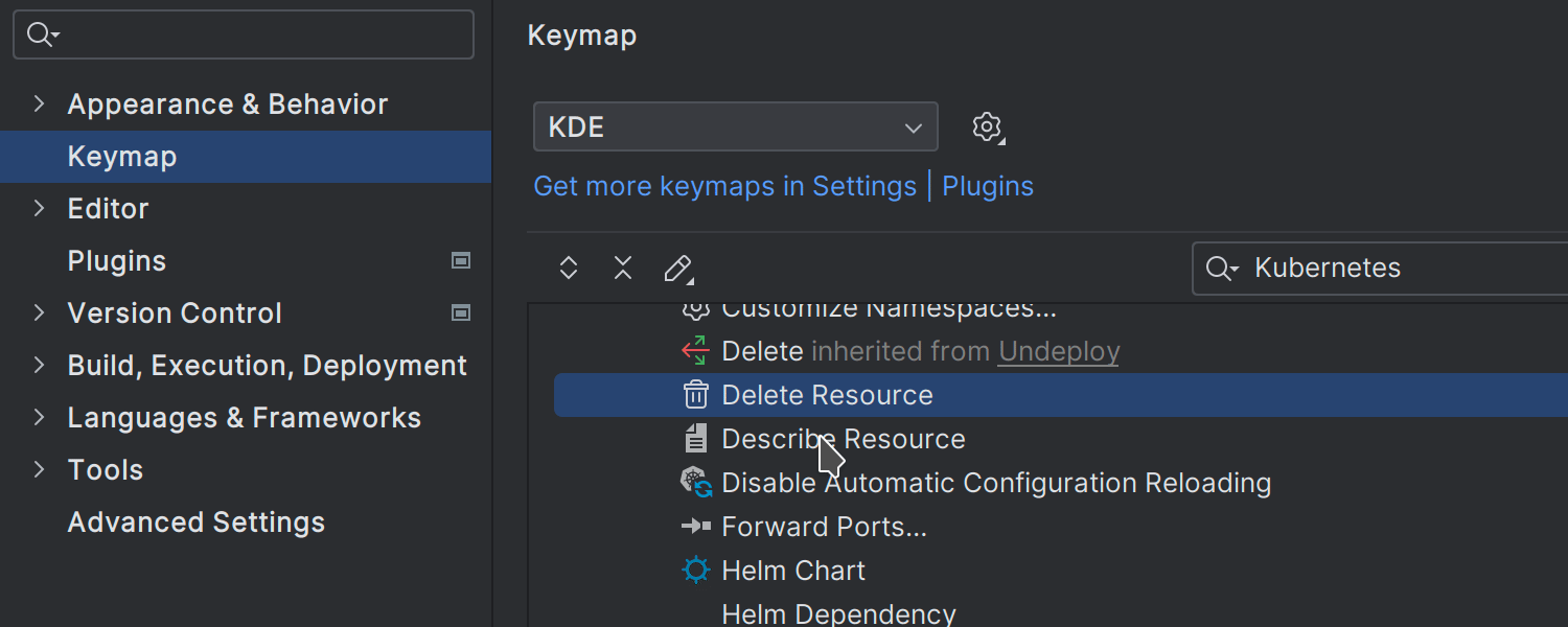 您现在可以在 Services(服务)视图中为大多数 Kubernetes 操作指定快捷键,例如 Forward Ports(转发端口)、 Delete Resource(删除资源)和 Describe Resource(描述资源)等。 按照此路径设置自定义快捷键:Settings/Preferences | Keymap | Plugins | Kubernetes(设置/偏好设置 | 按键映射 | 插件 | Kubernetes)。