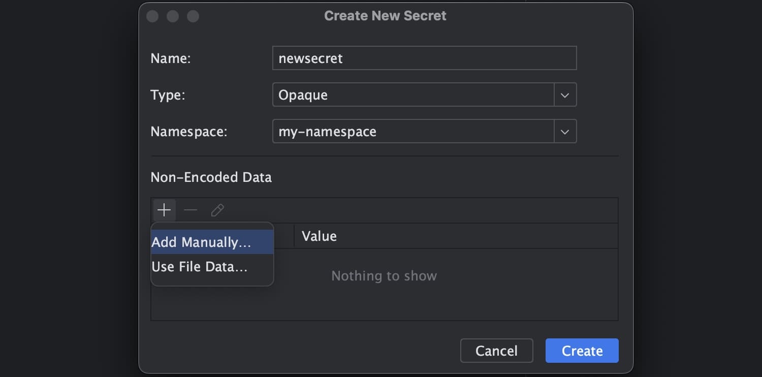 IntelliJ IDEA Ultimate 2023.1 引入了用于创建 Kubernetes 机密的新对话框。 要定义新机密,您可以手动输入 Key 和 Value 数据,也可以指定内容将被使用的文件。