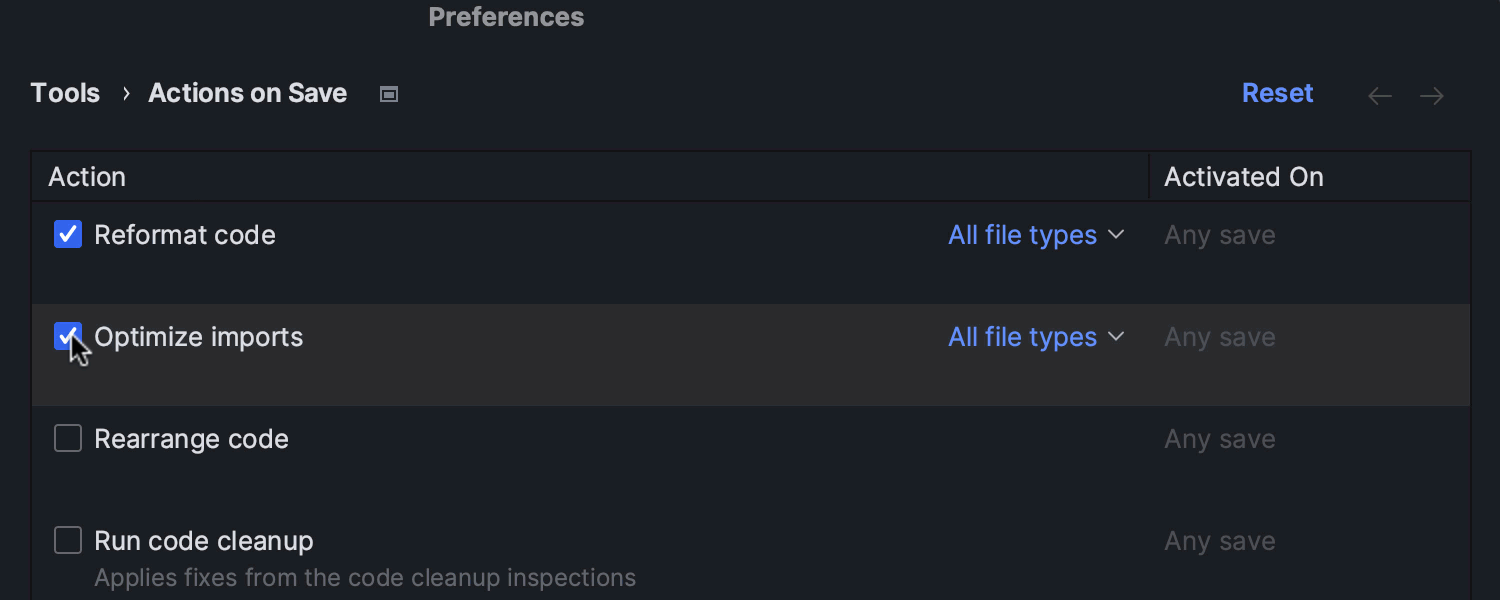 IntelliJ IDEA 2023.1 添加了为新项目预定义 Actions on Save(保存时的操作)行为的选项。 转到 File | New Projects Setup | Preferences For New Projects | Tools | Actions on Save(文件 | 新项目设置 | 新项目偏好设置 | 工具 | 保存时的操作),选择在未来项目中保存更改时要触发的操作。