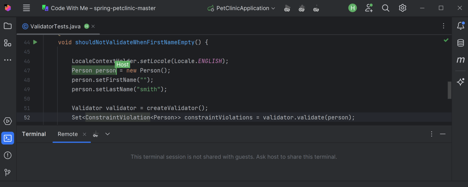 现在,当访客连接到会话时,他们的客户端看起来更像是常规的 JetBrains IDE。 访客可以看到主持人看到的所有条目,包括只有主持人可以访问的灰色条目。 访客可以清楚查看不可用的操作,并要求主持人代为执行。