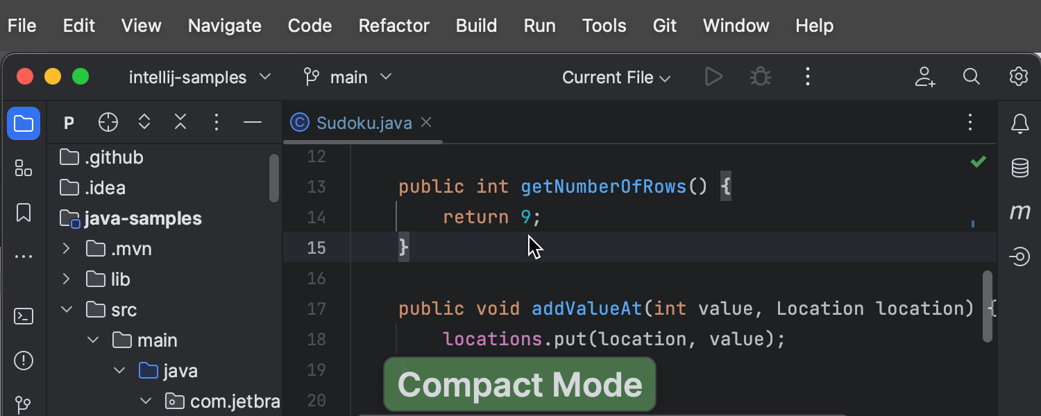 根据有关 IDE 新 UI 的反馈,我们针对最热门的请求实现了多项更新。 我们引入了 Compact Mode(紧凑模式),通过缩小间距和元素提供更统一的 IDE 外观。 新 UI 提供了垂直拆分工具窗口区域和便捷排列窗口的选项,与在旧 UI 中相同。 主窗口标题中的 Run(运行)微件经过重新设计,外观更柔和、更悦目。 详细了解新 UI 增强,我们也继续邀请您尝试新 UI!
