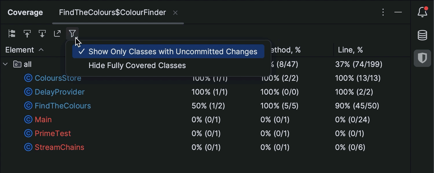 在 IntelliJ IDEA 2023.1 中,您可以在 Coverage(覆盖率)视图中筛选类,关注最近更新的类和测试时需要特别注意的方法。 默认情况下,您将看到一个包含未提交更改的类列表。 第二个筛选选项可以隐藏完全覆盖的类。