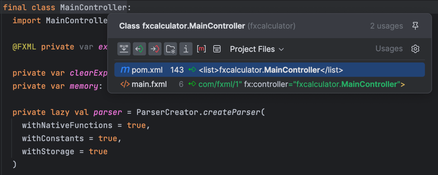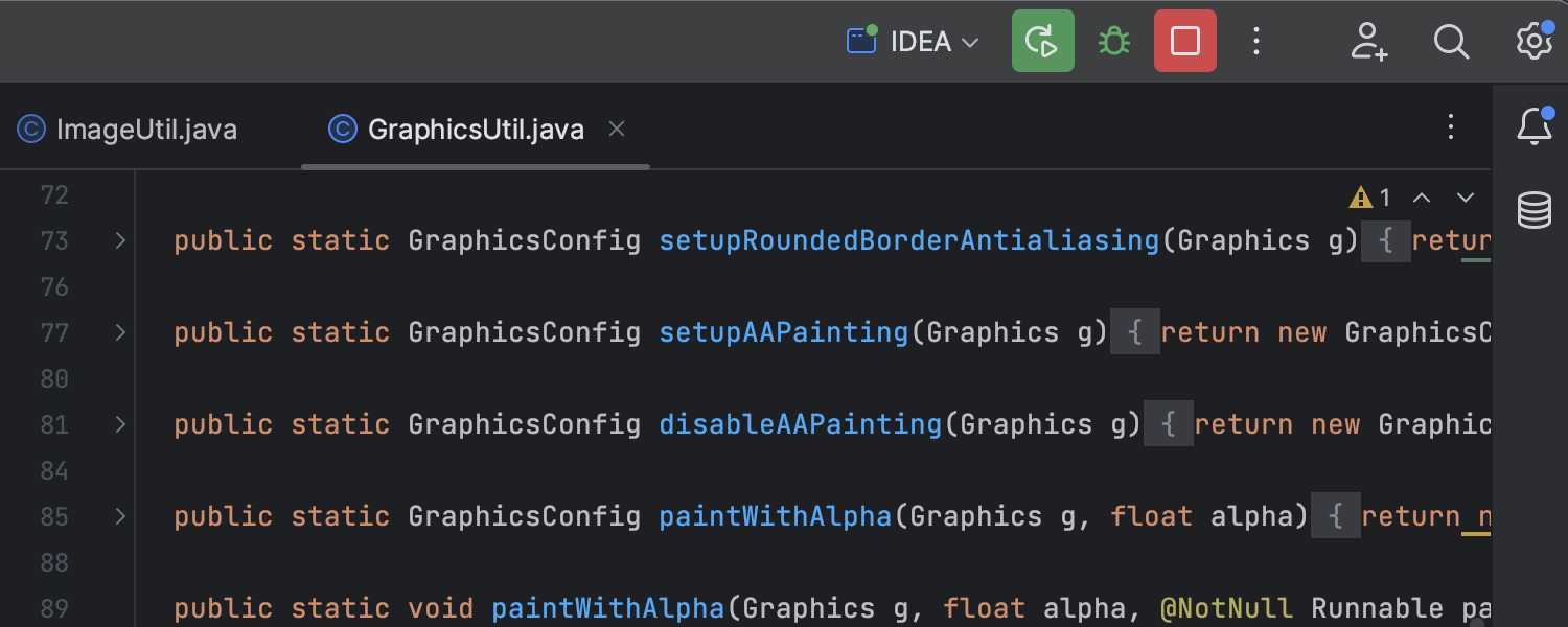 Unused declaration(未使用的声明)检查得到许多修正和改进。 IntelliJ IDEA 现在可以检测项目 XML 文件中的符号用法。 该检查还会区分对术语的引用和对类型的引用并正确标记。 Can be private(可为 private)检查也已更新。 例如,您不会再看到工作表和局部类中顶级定义的高亮显示。 对于递归调用,调用行的左侧将有一个装订区域图标。