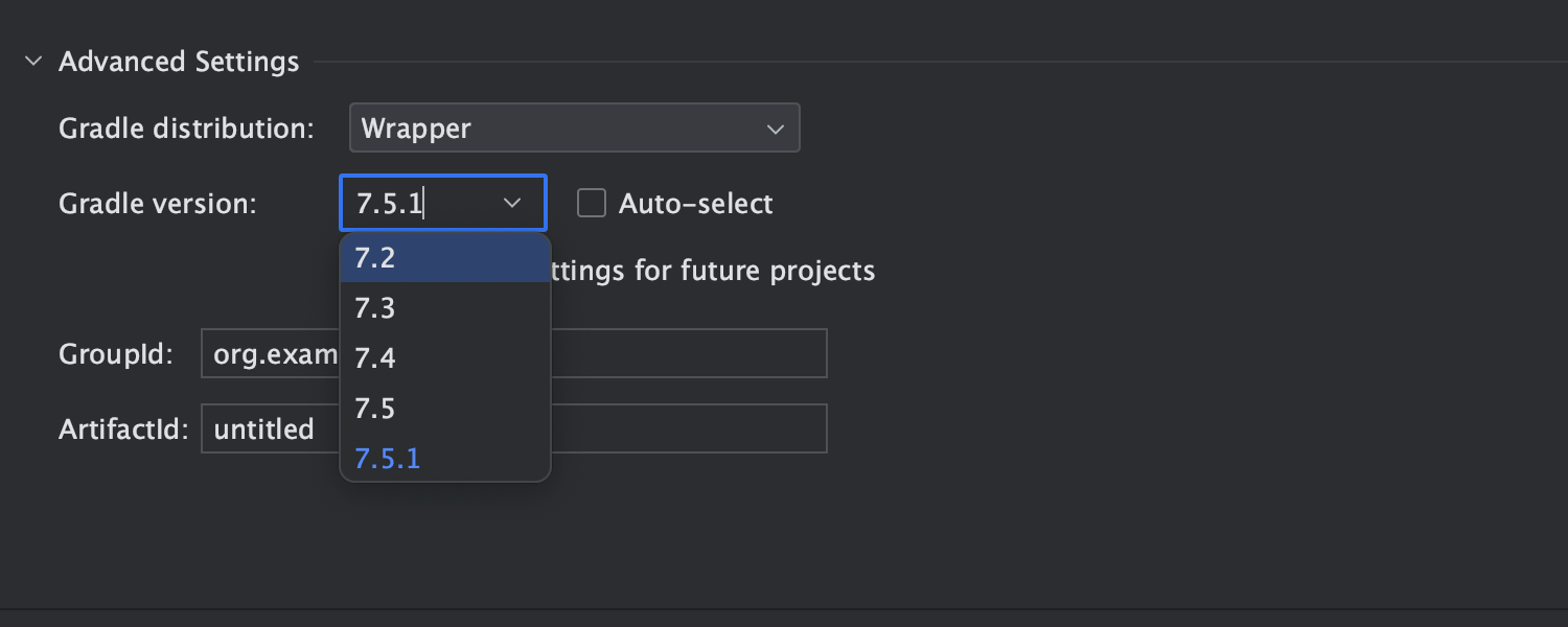 配置新的 Gradle 项目时,现在可以直接在 New Project(新建项目)向导中选择所需包装器版本。 展开 Advanced Settings(高级设置)版块,取消选中 Auto-select(自动选择),然后指定首选选项。 您可以在 Gradle version(Gradle 版本)组合框下方启用 Use these settings for future projects(将这些设置用于未来的项目),让 IDE 记住您的选择。