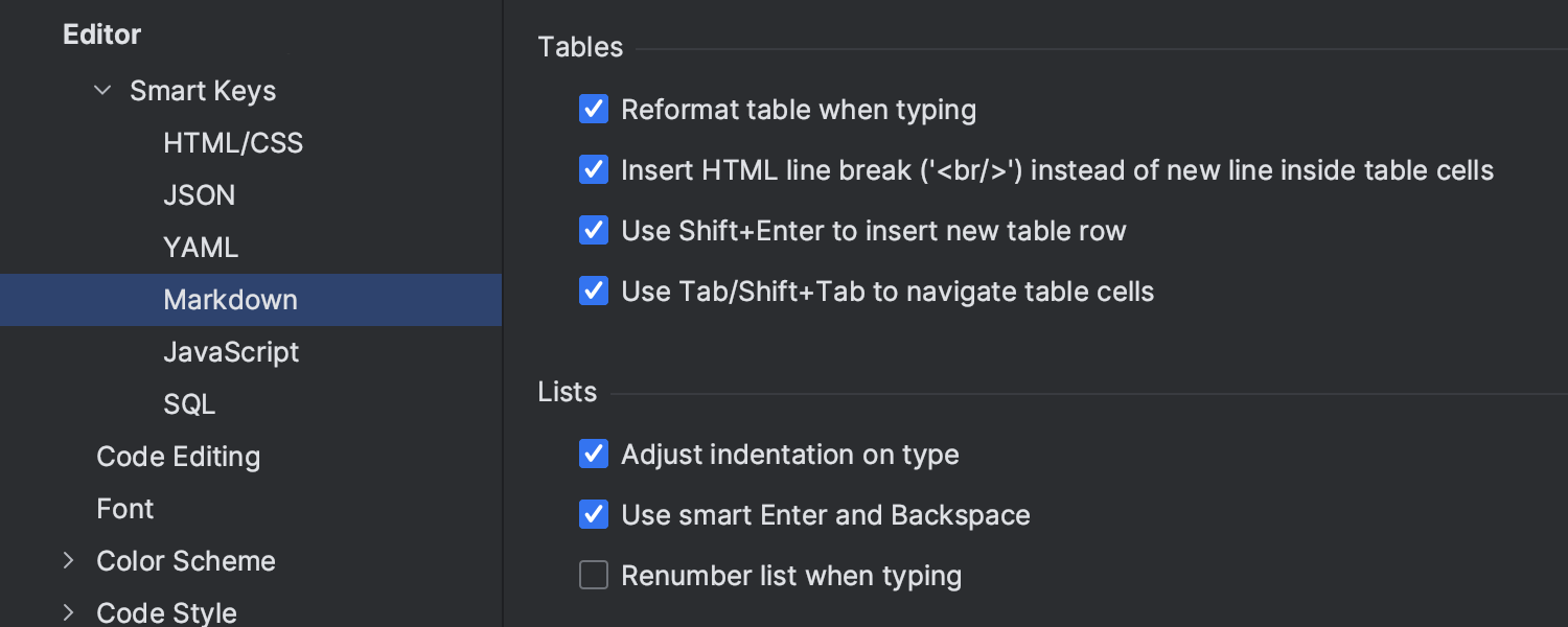 我们在 Settings/Preferences | Editor | General | Smart Keys(设置/偏好设置 | 编辑器 | 常规 | 智能按键)中添加了一个专属页面,用于配置和编辑 Markdown 偏好设置。 这个页面简化了偏好设置管理,为不同编辑器功能提供单独的复选框,取代了以前 Settings/Preferences | Languages & Frameworks(设置/偏好设置 | 语言和框架)中的单个复选框。