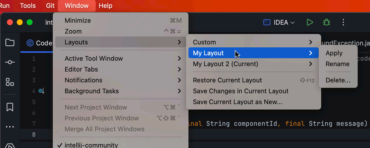 在 IntelliJ IDEA 2023.1 中,您可以保存和管理多个工具窗口布局,并根据需要在它们之间切换。 要保存新布局,首先请根据需要排列工具窗口,然后转到 Window | Layouts | Save Current Layout as New(窗口 | 布局 | 将当前布局另存为新布局)。 如果您进一步调整布局,可以使用 Save Changes in Current Layout(保存当前布局中的更改)选项更新当前设置,或将这些更改保存为单独的自定义布局。 要激活已保存的布局,首先在 Window | Layouts(窗口 | 布局)的列表中找到它,将鼠标悬停在它的名称上,然后点击 Apply(应用)。