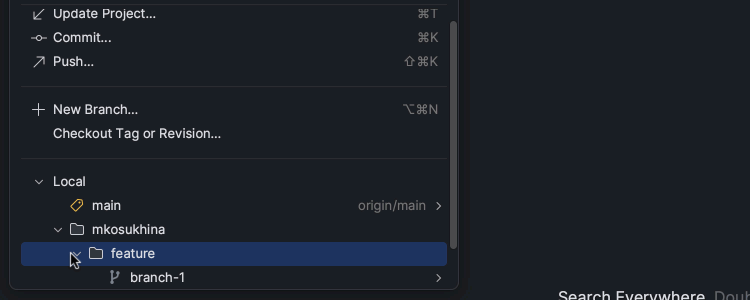 IntelliJ IDEA 2023.1 在 Create New Branch(创建新分支)弹出窗口中提供了自动补全。 为新分支输入名称时,IDE 将根据现有本地分支的名称建议相关前缀。