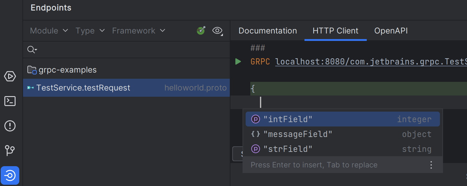 在 IntelliJ IDEA Ultimate 2023.1 中,可以从包含 .jar 存档中 import 的 proto 文件运行 GRPC 请求。 我们还改进了请求主体的代码补全,例如 OneOf 和 Map<K,V> 类型。 此外,我们在 Endpoints(端点)工具窗口中为 Protobuf 端点添加了 HTTP Client(HTTP 客户端)标签页。