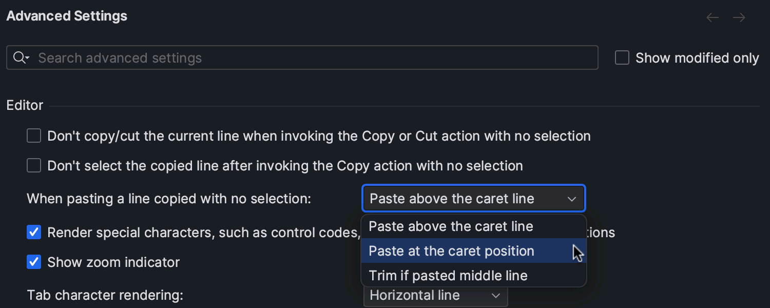 在 v2023.1 中,我们微调了粘贴复制或剪切时未选择内容的行时的用户体验。 新增了一个允许您控制粘贴内容位置的特殊设置。 在 Settings/Preferences | Advanced Settings(设置/偏好设置 | 高级设置)中,找到 Editor(编辑器)版块,然后从下拉列表中为 Paste(粘贴)操作选择所需行为。