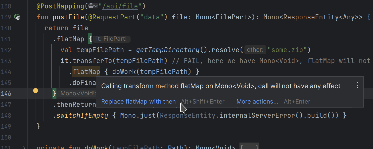 IntelliJ IDEA Ultimate 2023.1 为反应式代码提供了更广泛的检查。 例如,IDE 现在报告 Reactor 3 参考指南 中描述的 Mono<Void> 类型的变换操作符的用法。