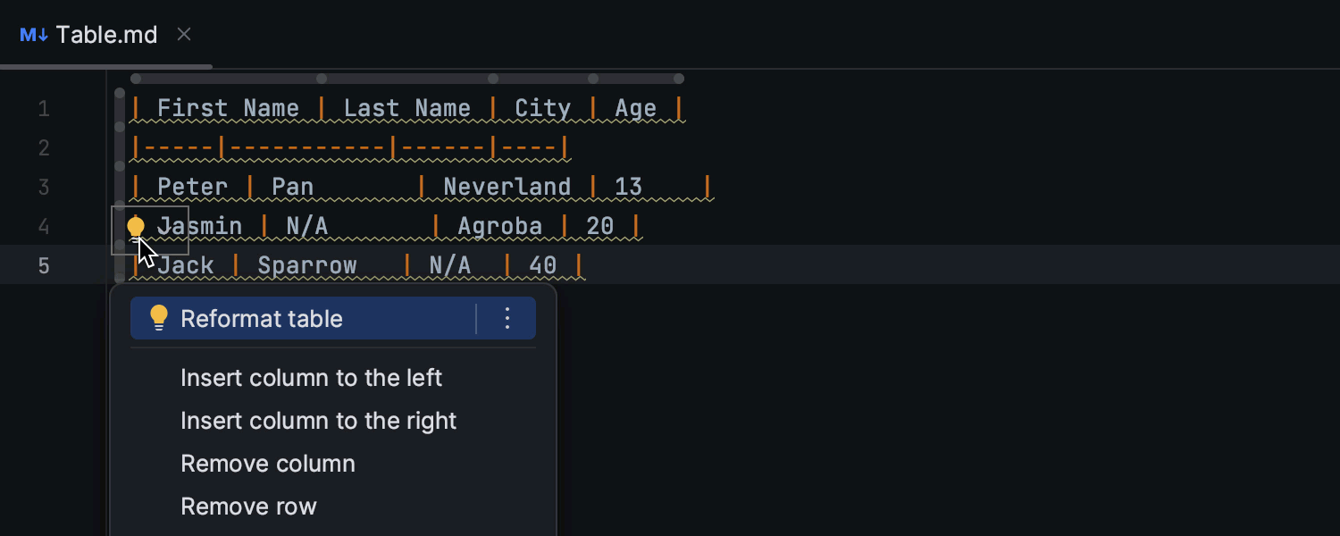 一项新意图操作可用于更正 Markdown 文件中表的格式设置。 您可以通过 Context actions(上下文操作)快捷键 (Alt+Enter) 或点击黄色灯泡图标并从出现的列表中选择 Reformat table(重新格式化表)来使用快速修复。