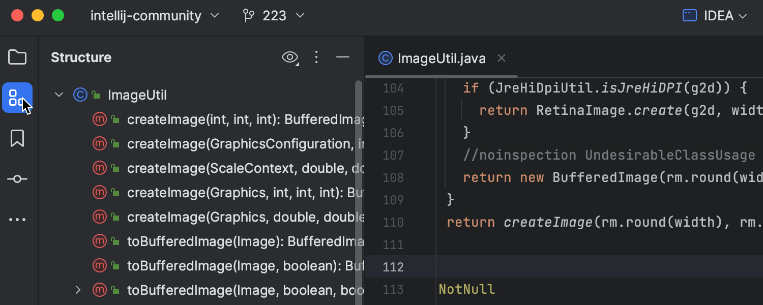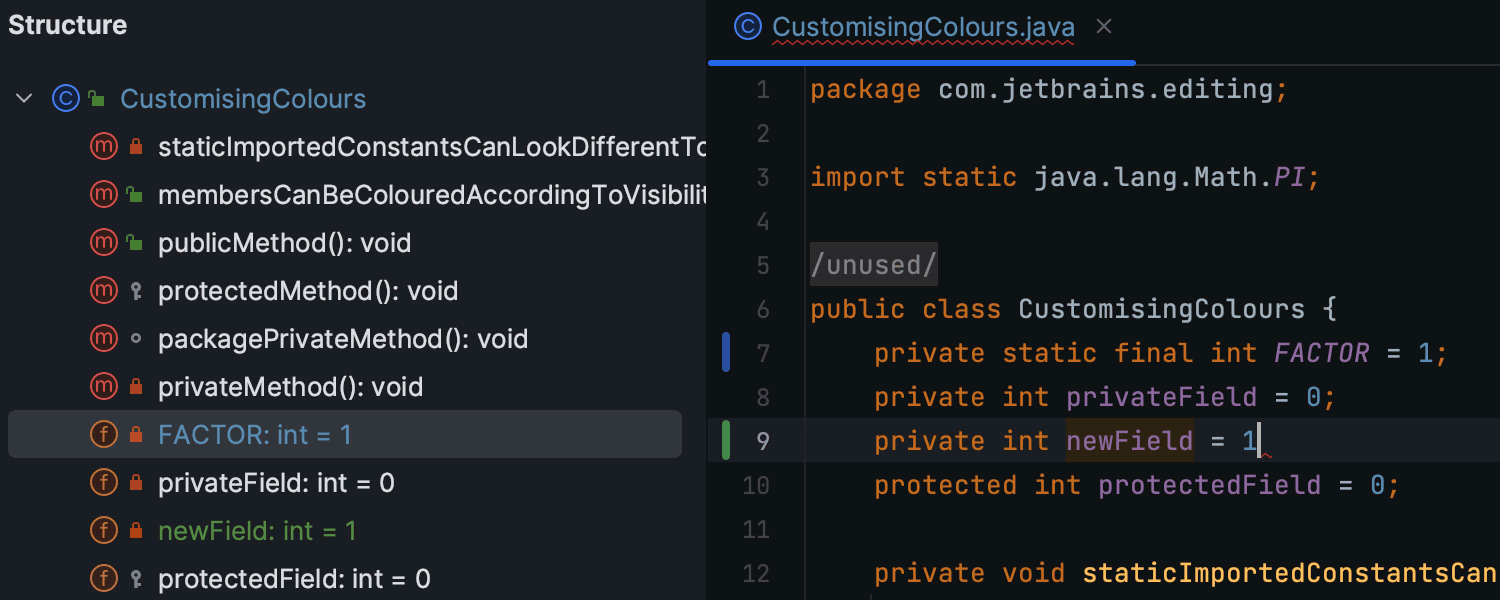 我们在 Structure(结构)工具窗口中添加了颜色提示,使文件更改更易于跟踪。 被修改对象的名称现在为蓝色,新添加对象的名称在工具窗口中高亮显示为绿色。
